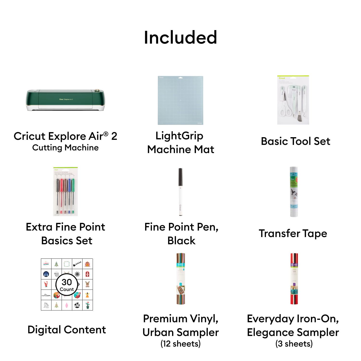 - INCLUDES - Cricut Explore Air 2 Cutting Machine, LightGrip Machine Mat, 5-Piece Tool Kit, Fine Point Pen Sets (Colors + Black), Transfer Tape Roll, Vinyl Sampler Roll, Iron-On Roll, & 30 images of digital content