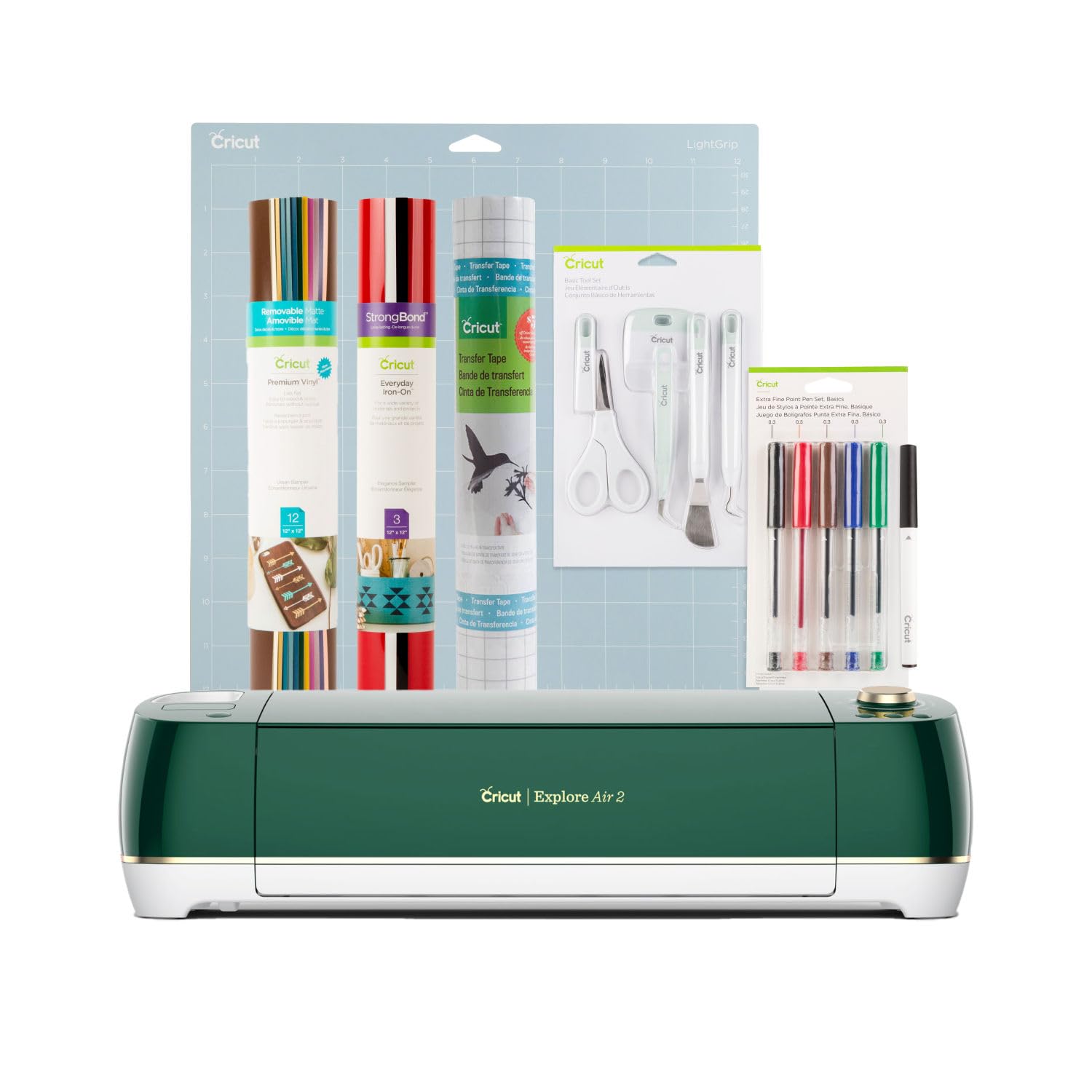 Details: Get a cutting machine and the supplies you need to customize almost anything with Cricut Explore Air® 2 in Emerald + Get Started Kit. Includes our classic smart cutting machine, designed with simplicity and value in mind for every crafter. Plus, a variety of materials & essential crafting tools to start making. Cricut Explore Air 2 works with the free Design Space® app.
