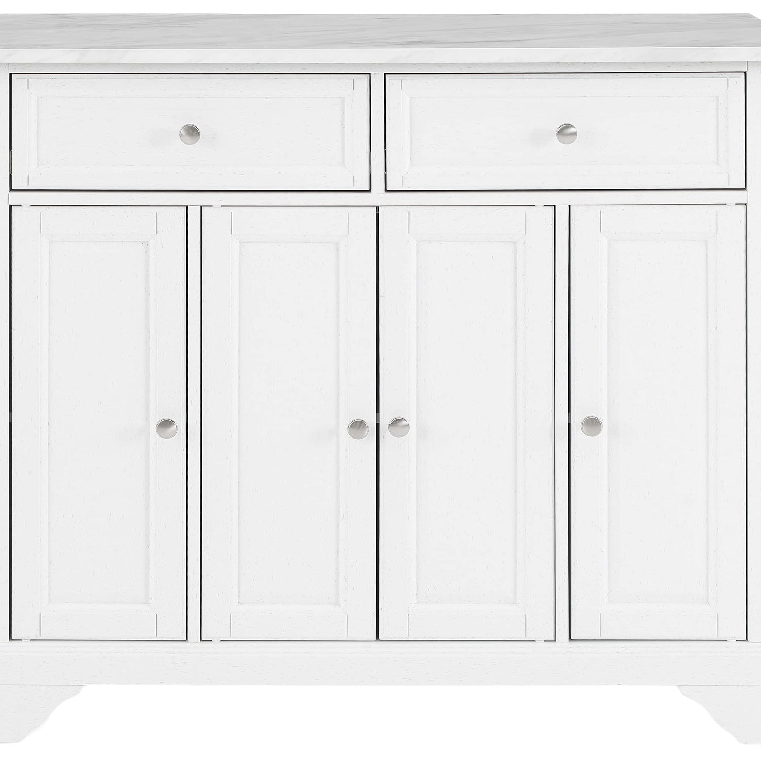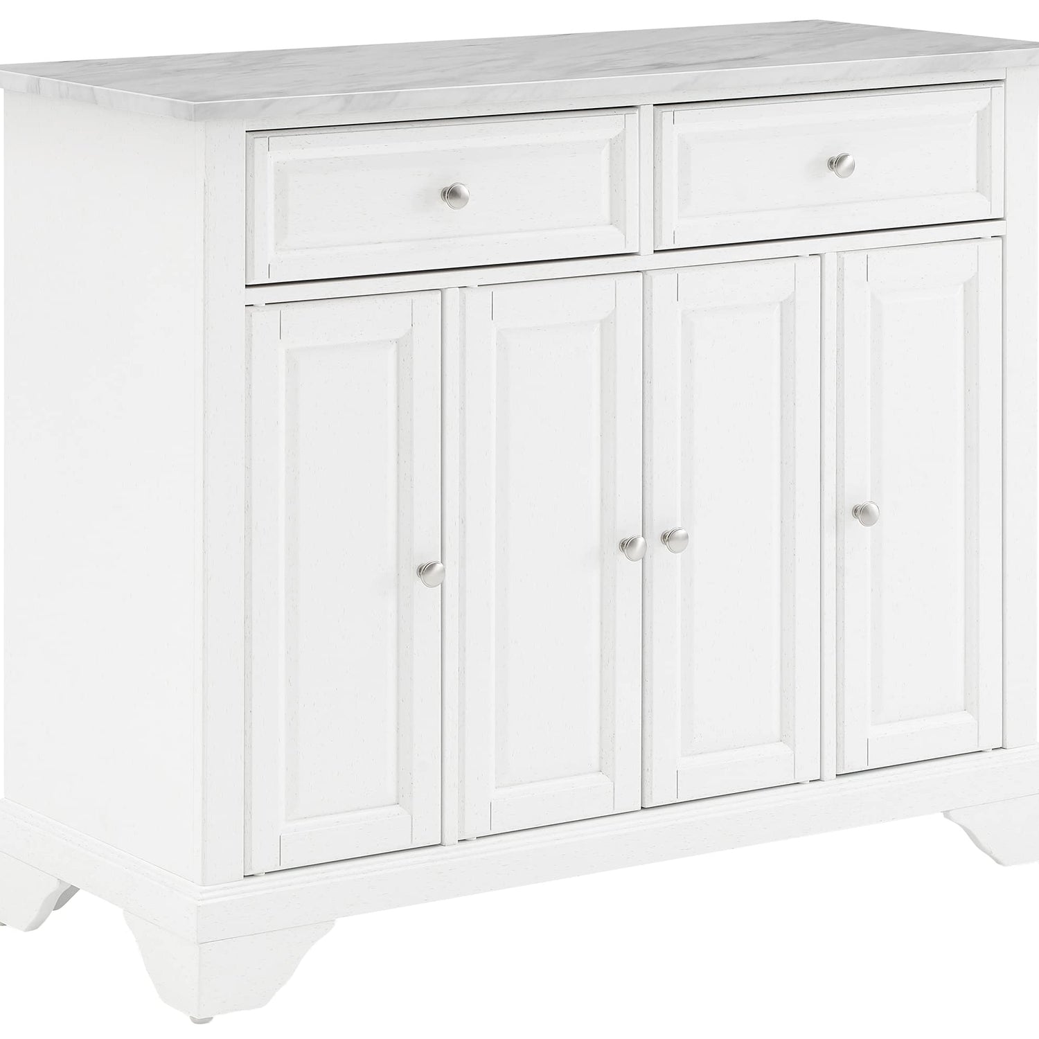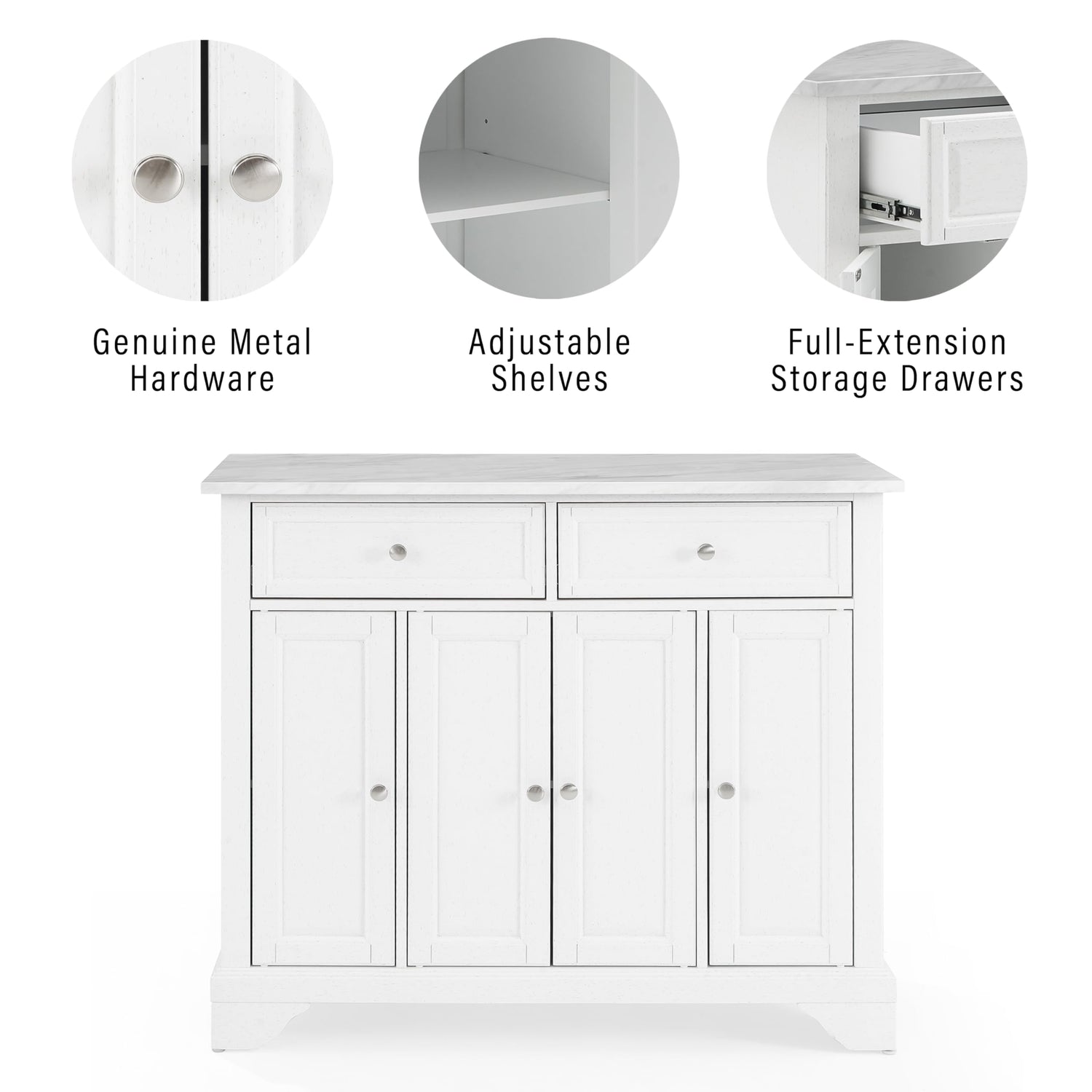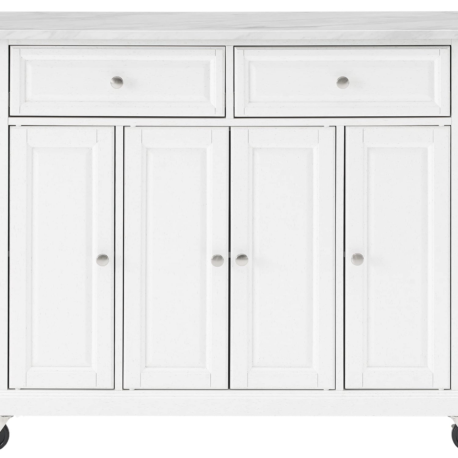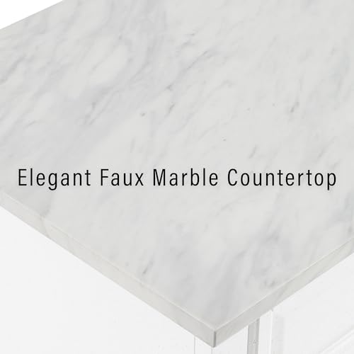 - MODERN KITCHEN FURNITURE: This kitchen island features a white faux marble top and distressed white base. The genuine metal hardware in brushed nickel and beautiful raised panel doors make it a perfect fit for traditional and farmhouse decor.