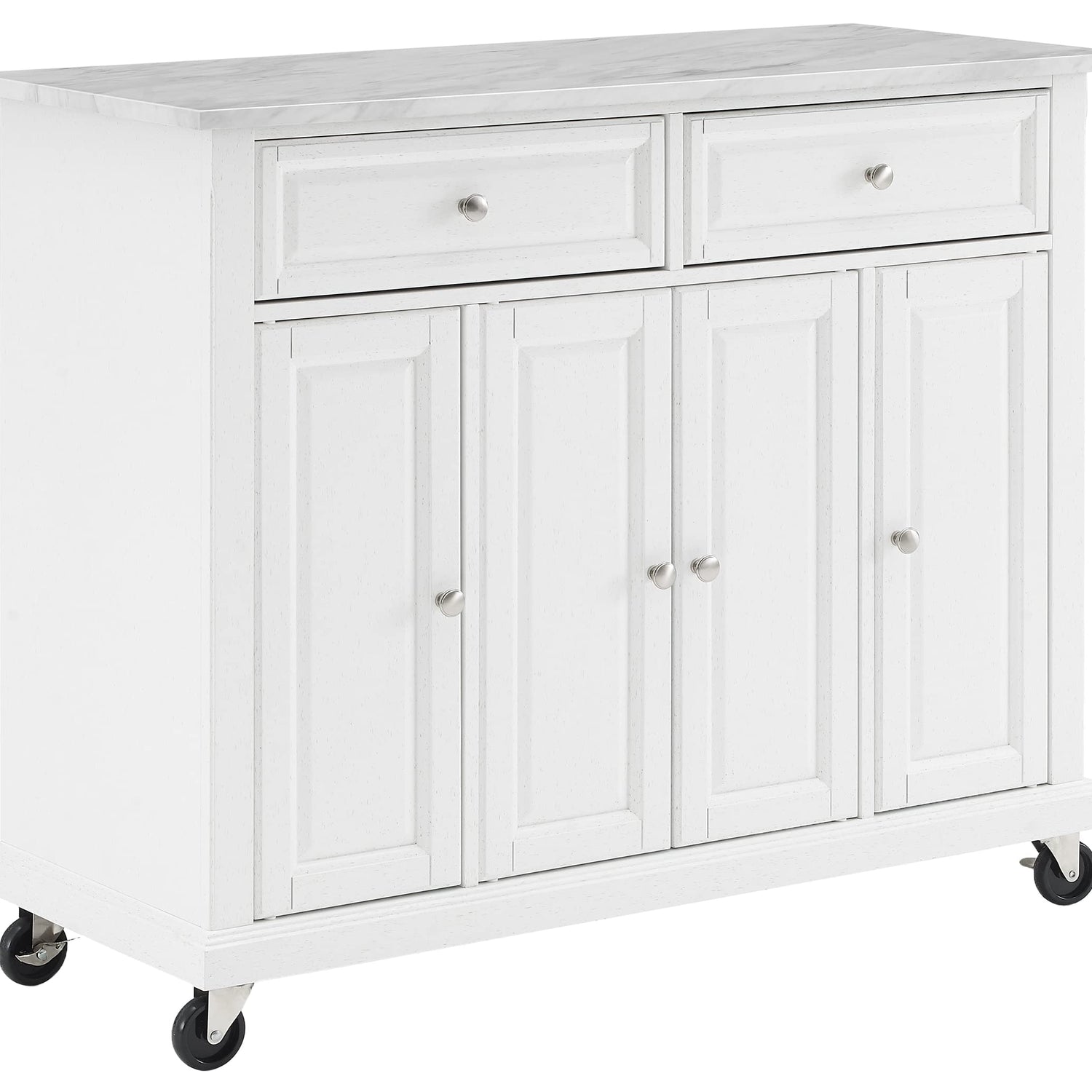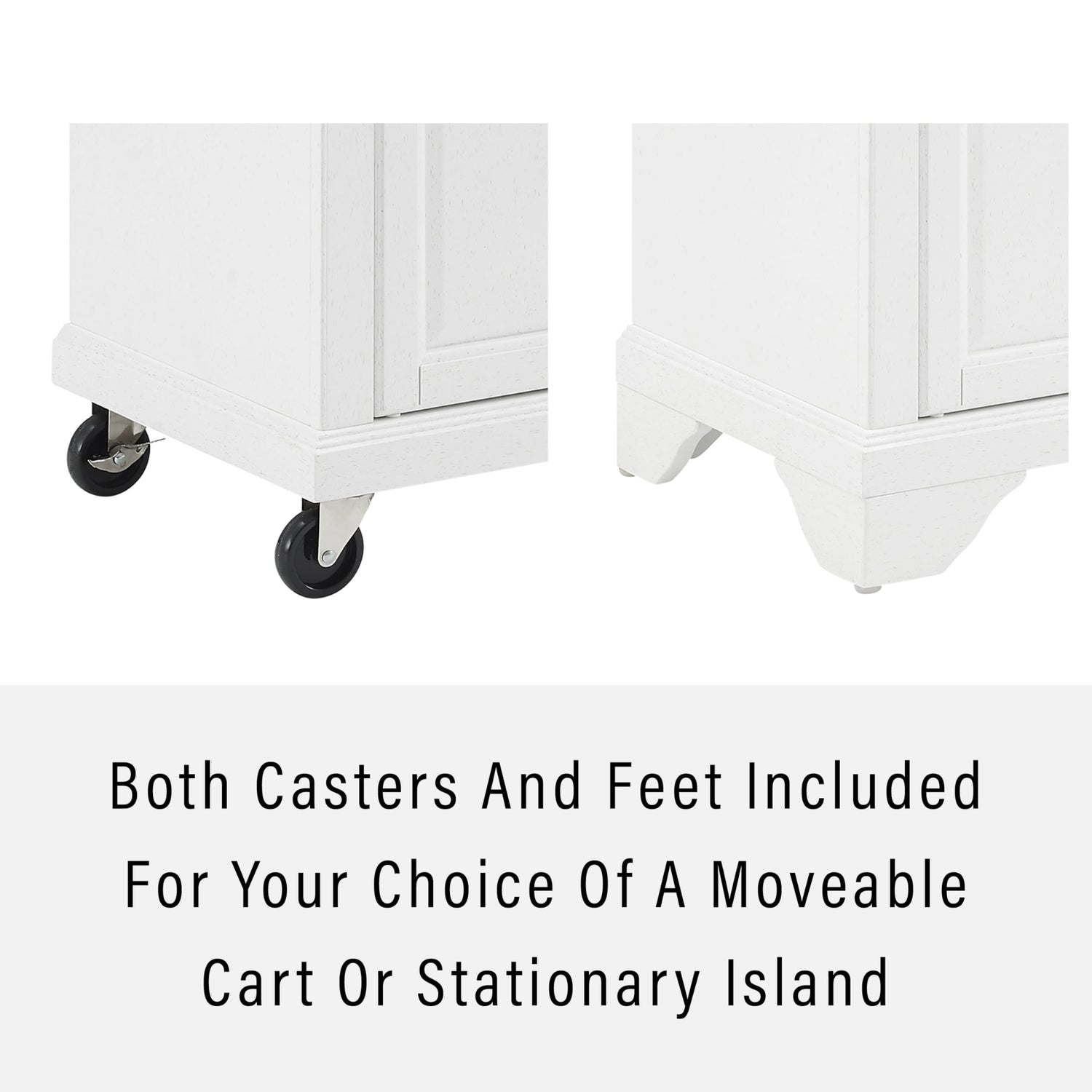 Details: Bring elegance and function to your kitchen with the Avery Kitchen Island/Cart. Featuring a beautiful faux-marble countertop, this island is ideal for food prep or buffet-style serving. Two large drawers keep utensils and small kitchen items organized, while three cabinets with adjustable shelves are perfect for tucking away pots and pans. Both casters and feet are provided for your choice of a stationary island or a rolling cart, making the Avery Kitchen Island/Cart a wise addition to your kitchen space.