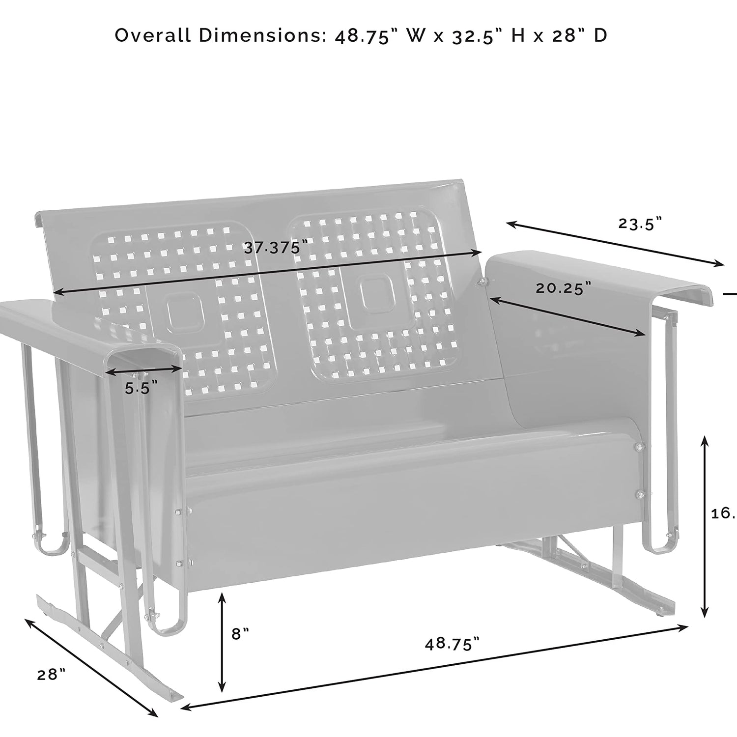Details: Glide back into lazy summer afternoons with the Bates Loveseat Glider. This vintage-style loveseat comes in a variety of vibrant colors, offering a fun outdoor lounging experience. The back features a unique basket weave design that allows air to circulate, and the base has a smooth gliding mechanism for relaxing in comfort. Made of durable steel, this glider has a powder-coated finish that resists rust and sun fade. The Bates Loveseat Glider is sure to add a dash of retro fun to your porch or patio.