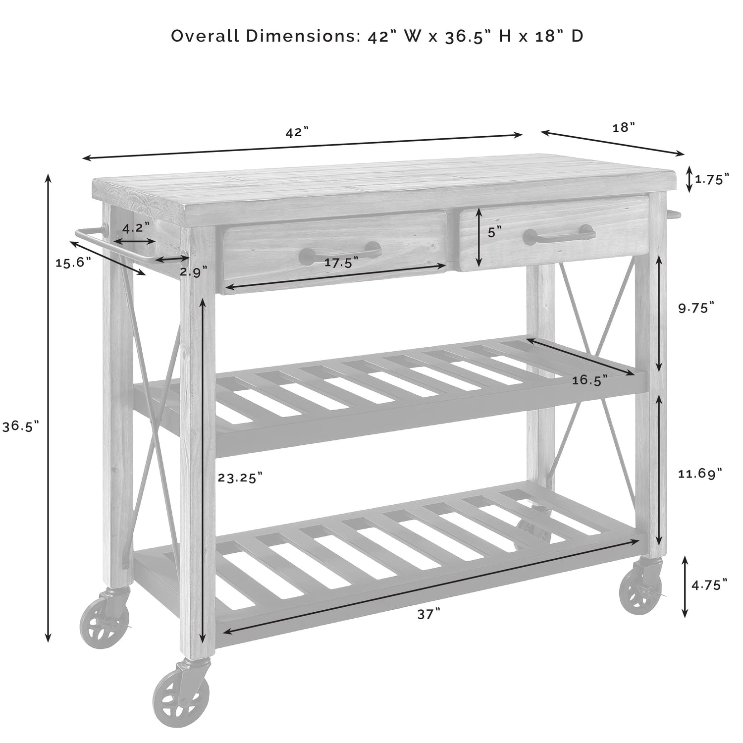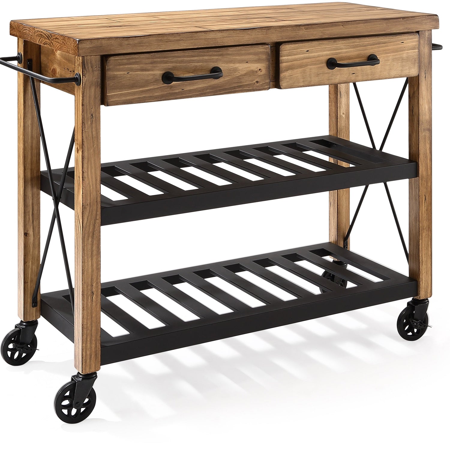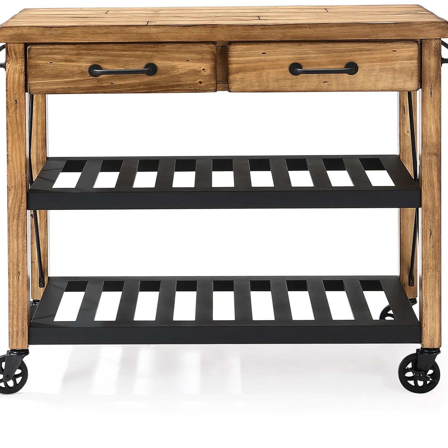 Details: The relaxed lifestyle of French Wine country comes to life in Crosley Furniture's Roots Rack. Its rustic design is reflective of a time when recycling wasn't a societal choice, but a way of life. Starting with a solid pine top, Crosley simulates the popular "reclaimed" wood look by hand–etching a weathered plank design into the surface. The rich honey finish extends to the sturdy legs, riding on industrial style casters wrapped in rubber. Two spacious drawers sit on full-extension glides, providing maximum utility. The sturdy metal shelves are finished in black, and are perfectly notched to secure individual wine bottles. Completing the package are industrial style drawer pulls, towel bars, and X-supports. The Roots Rack is perfect for any kitchen activity - slicing, dicing, mixing, or mingling.