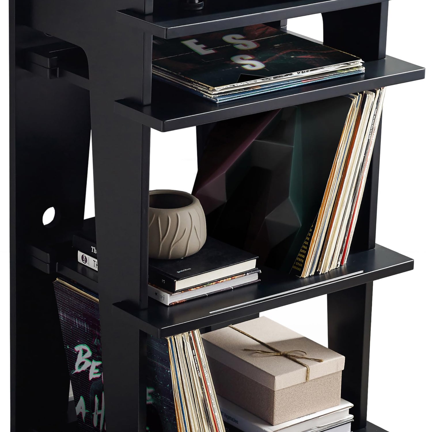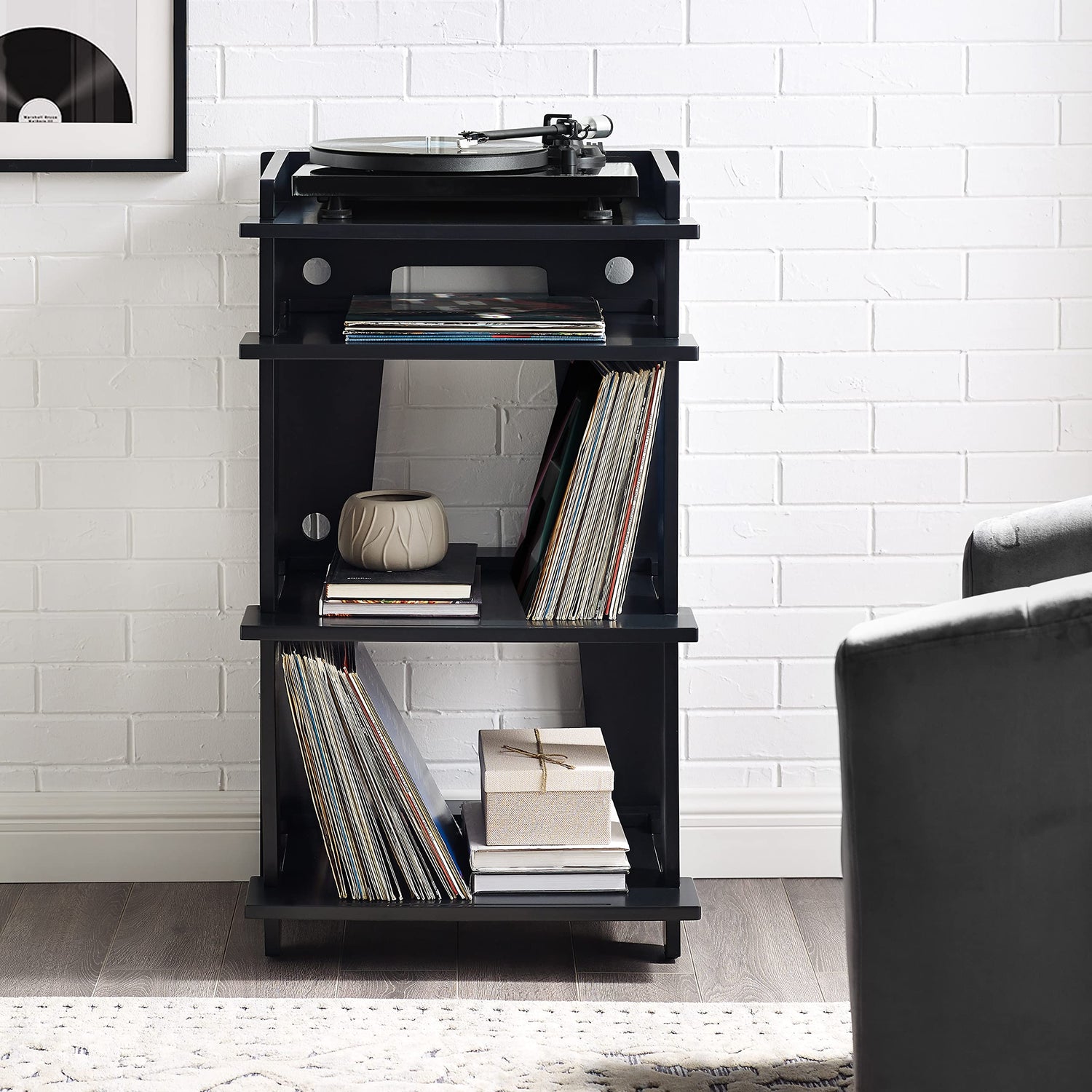 Details: The Soho Record Player Stand is what every vinyl lover needs. The top shelf fits most component-style turntables, while the second is perfect for audio accessories. Cable management holes ensure cords stay organized and out of view. Each lower shelf holds up to 100 records and features bumpers in the back to keep your albums in place. Grooves on the lower storage shelves let you display the jacket of the record you're playing. This modern turntable stand creates a personal listening room anywhere in your home.