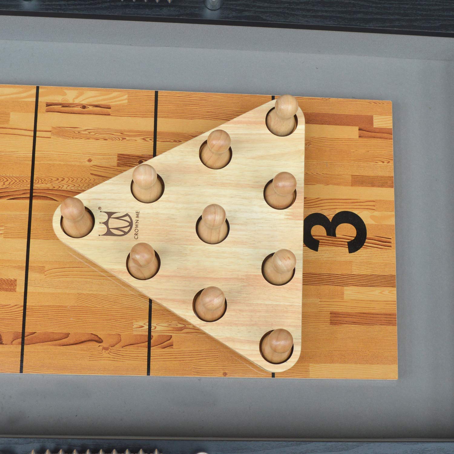 Details: Instantly turn your shuffleboard table into an mini-bowling alley with the CROWN ME Shuffleboard Bowling Pin Set. This 10-pin triangular rack is crafted from environmentally safe, durable MDF material covered in a beautiful wood grained melamine. Ensure accurate pin placement every time by inserting the solid wood bowling pins in the triangular template holes. Simply lift the rack and remove and you are ready to play. Take aim and glide your shuffleboard puck towards the pins and let the competitive fun begin (shuffleboard pucks not included).