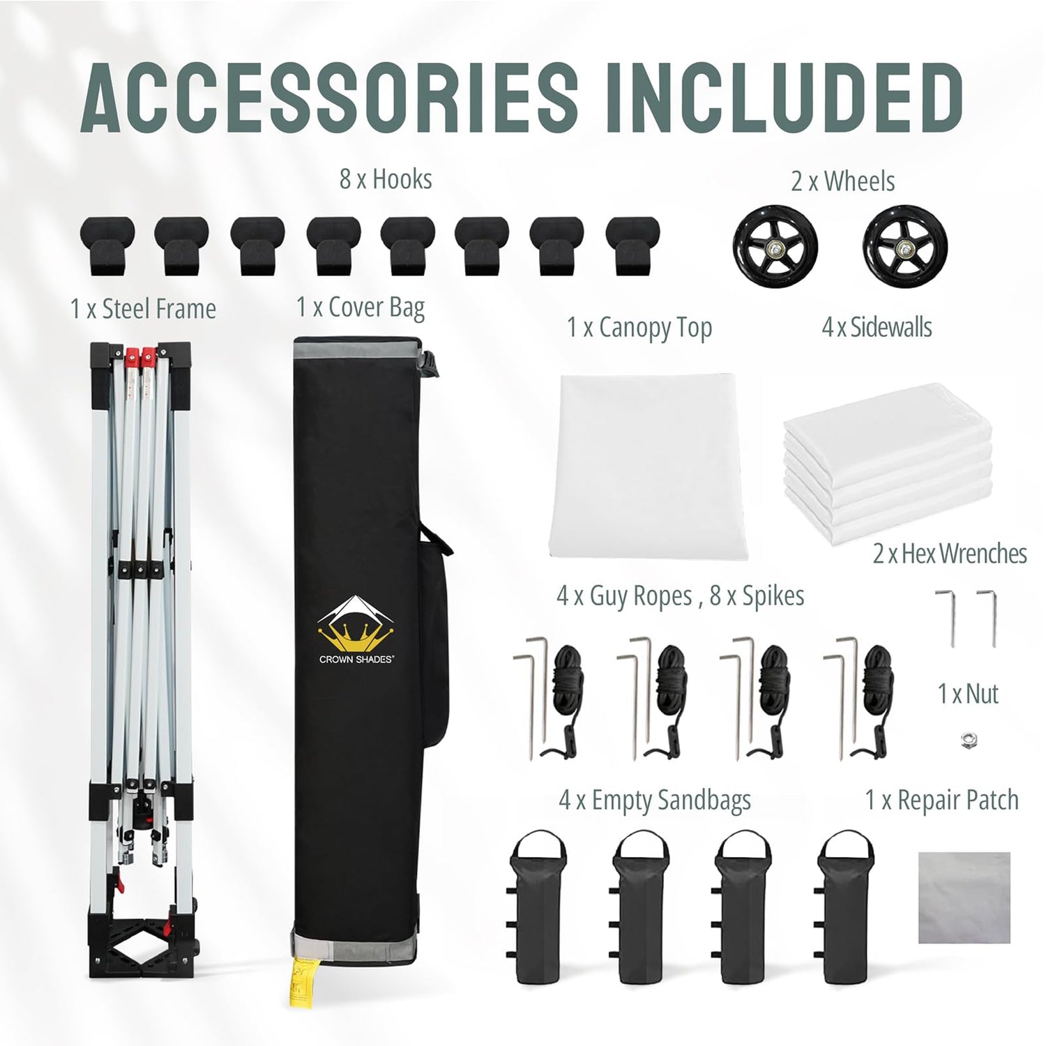 Details: CROWN SHADES 10x10 Pop Up Canopy Tent Instant Commercial 1-Person Setup Patended Centerlock with 400D Silver Coated Fabric, 4 Sidewalls, 4" Wheels, 4 Upgraded Weights, Sto'N Go Bag, White