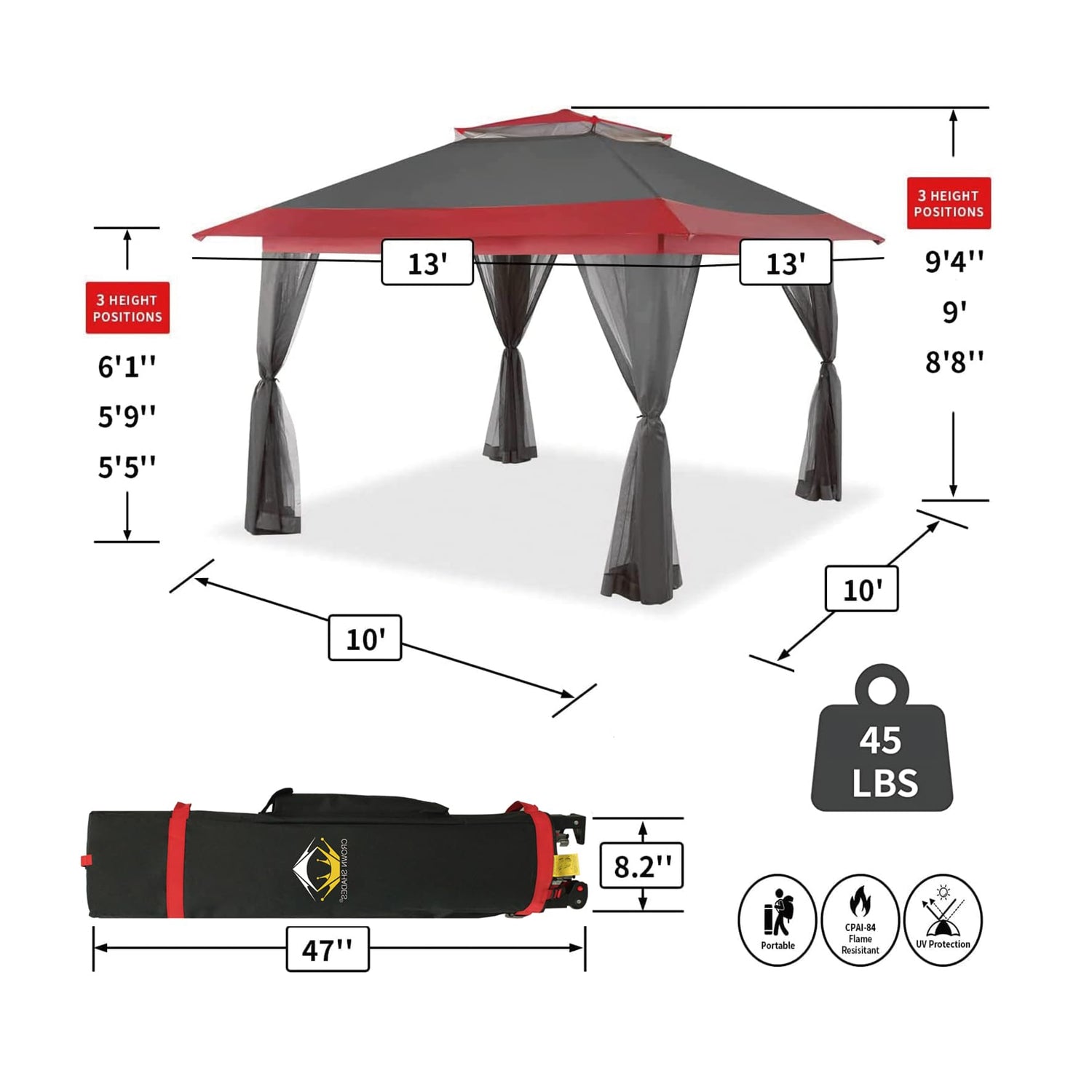 - [LARGE SPACE]: Base dimensions are 10' x 10'. Canopy dimensions are 13' x 13' with 169 square feet of shade. Over 9’ maximum interior height, and over 6’ maximum clearance under the valance. Plenty of standing room, and 14 people can sit comfortably in the cool shade.