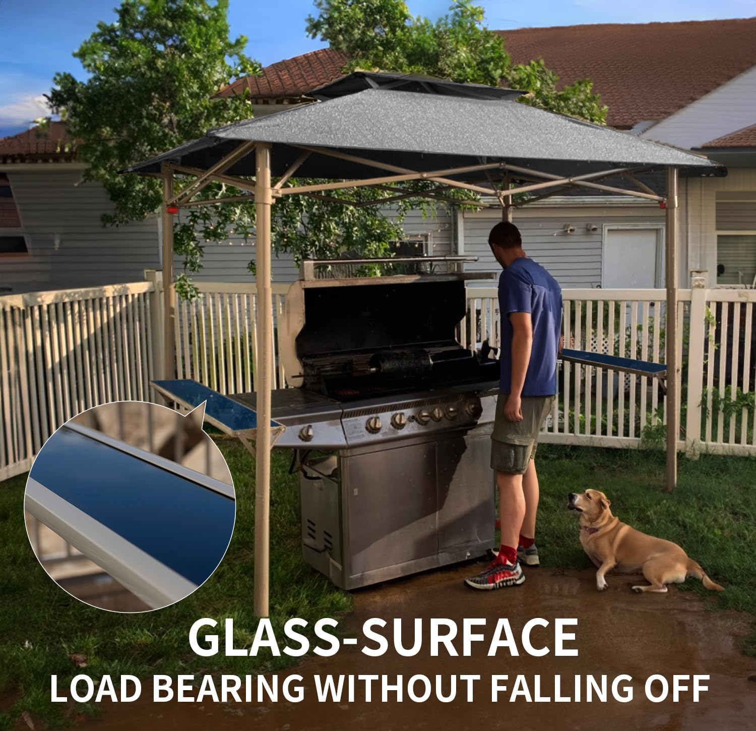 - The aluminum plastic side shelves can arrange the items needed for grilling. The glass panel is easier to clean and will not rust.