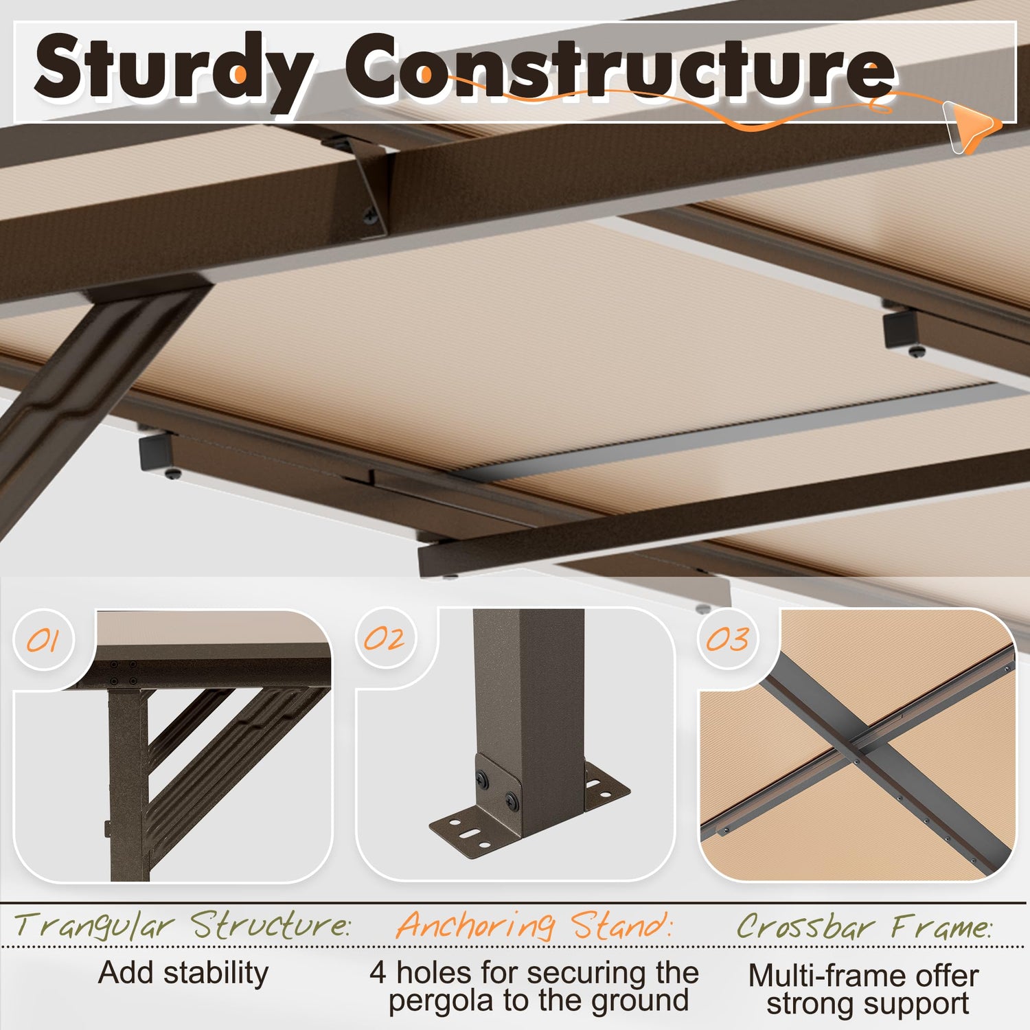 Constructed with 6mm polycarbonate hollow panels and a sturdy metal frame, the roof provides shade and rain protection while retaining warmth for comfort Versatile for courtyards, terraces, poolsides, or patios, this gazebo offers shade and shelter.