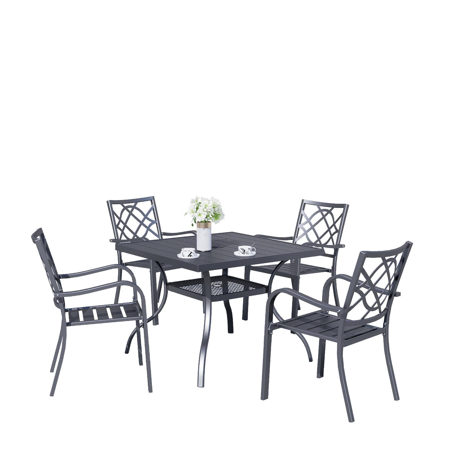 Crownland 5 Piece Outdoor Dining Set, Patio Metal Dining Sets, 4 Stackable Metal Chairs and Square Outdoor Dining Table with 1.57" Umbrella Hole, for Backyard, Lawn, Garden (Classic Black)