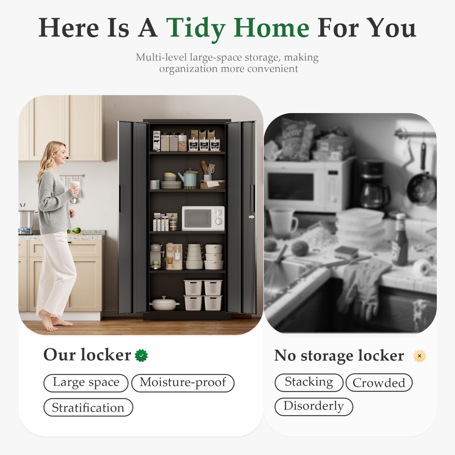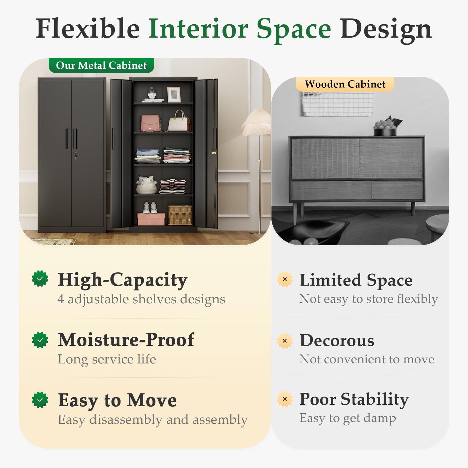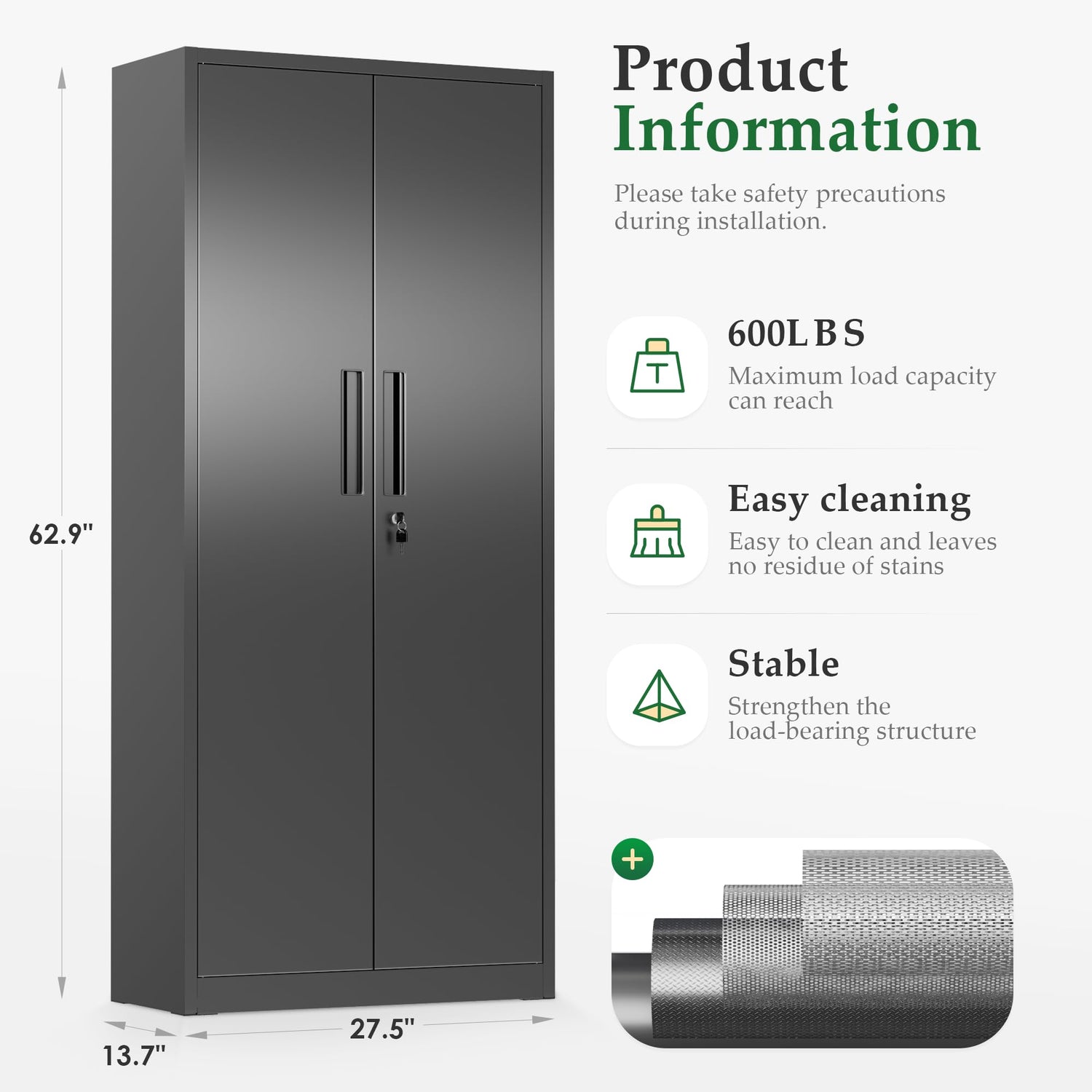 - 【Multiple uses】Multi-functional locking storage cabinets help to organize items and avoid clutter. The storage cabinet is perfect for storing cans, pet supplies, cleaning supplies, books, heavy-duty tools, and other items.