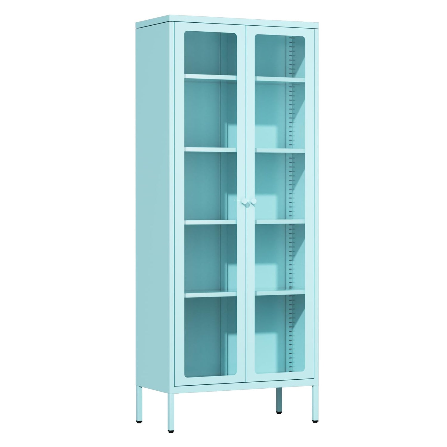 Crownland Metal Storage Cabinet with Glass Doors, Display Curio Glass Cabinet with 4 Adjustable Shelves, Tall Modern Office Storage Cabinets for Home Office, Living Room, Pantry(Light Blue)
