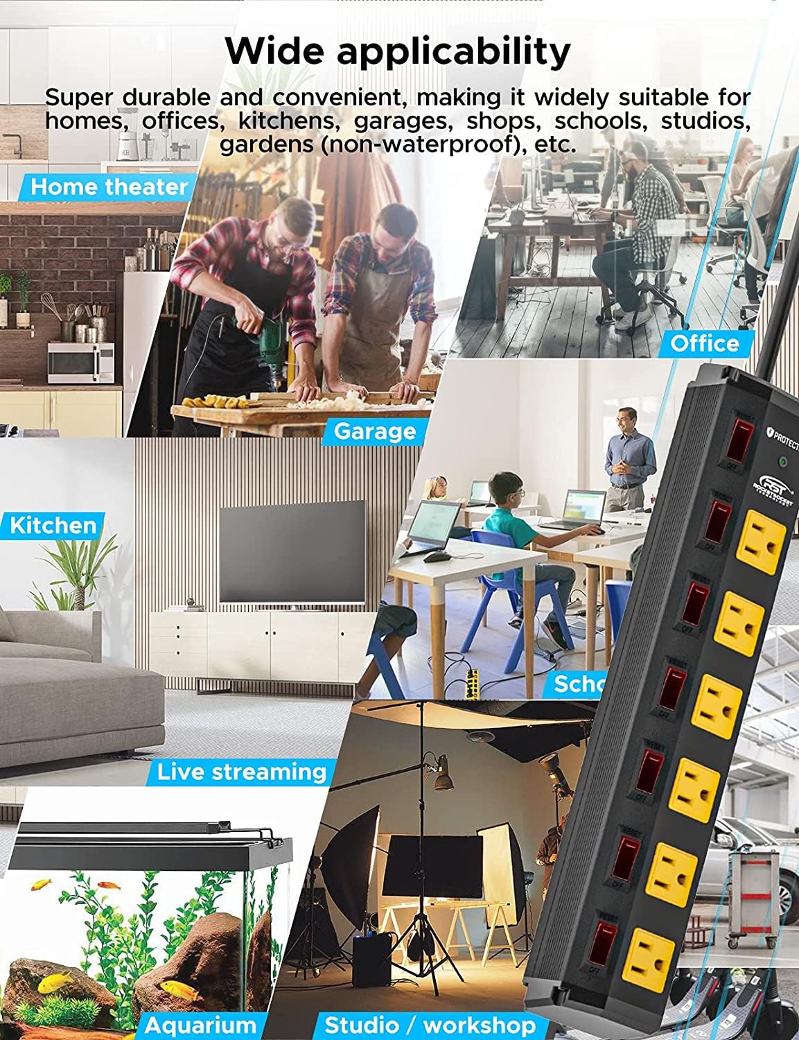 - [Full Protection] 1200 joules of protection protects your electronics from damage caused by surges, spikes or power outages. 15 amp circuit breaker is equipped with instant response to catastrophic events and overloads for maximum protection. 14AWG UL listed extension cord with 3-hole grounded plug brings more comprehensive safety protection.