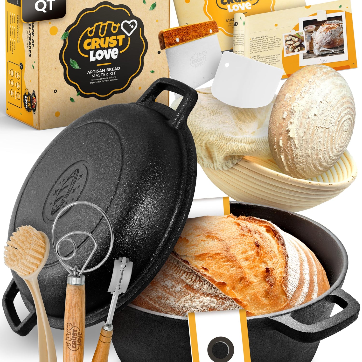 Crustlove Cast Iron Dutch Oven for Bread Baking - incl. Sourdough Bread Baking Supplies like Banneton Bread Proofing Basket - 5QT Cast Iron Bread Oven with Lid Bread Banking Pan Pot Scoring Tool Lame