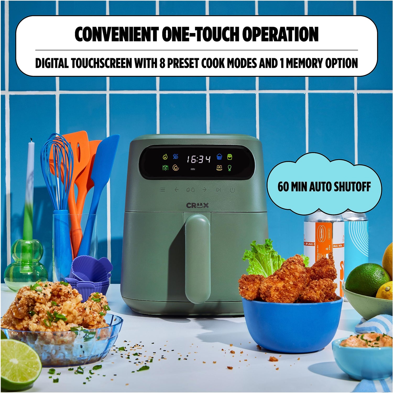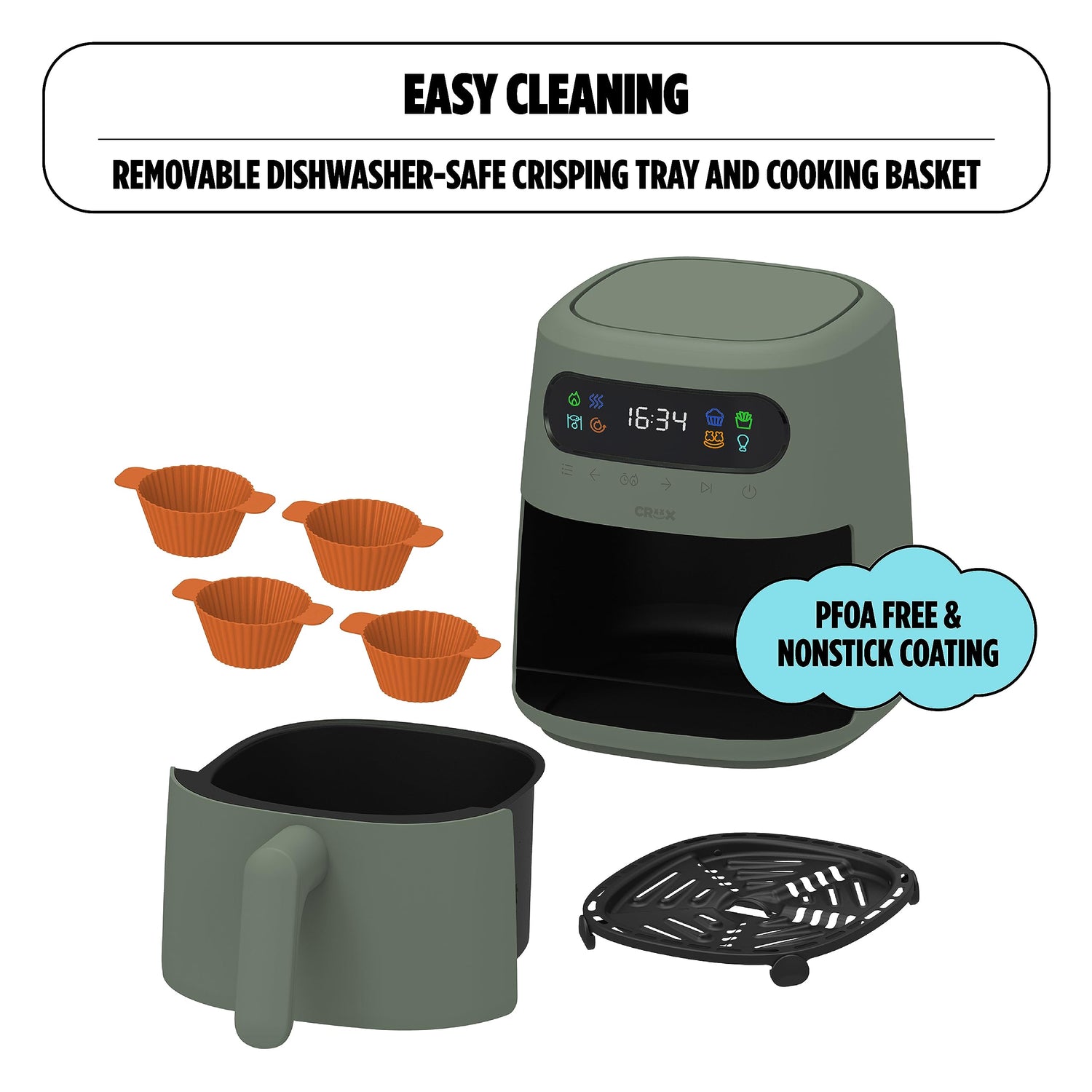 CRUX x Marshmello 3.0 QT Digital Air Fryer with TurboCrisp Technology, Touch Screen Temperature Control, Timer and Auto Shut-off, Fully Programmable, Silicone Cupcake Molds Included, Olive