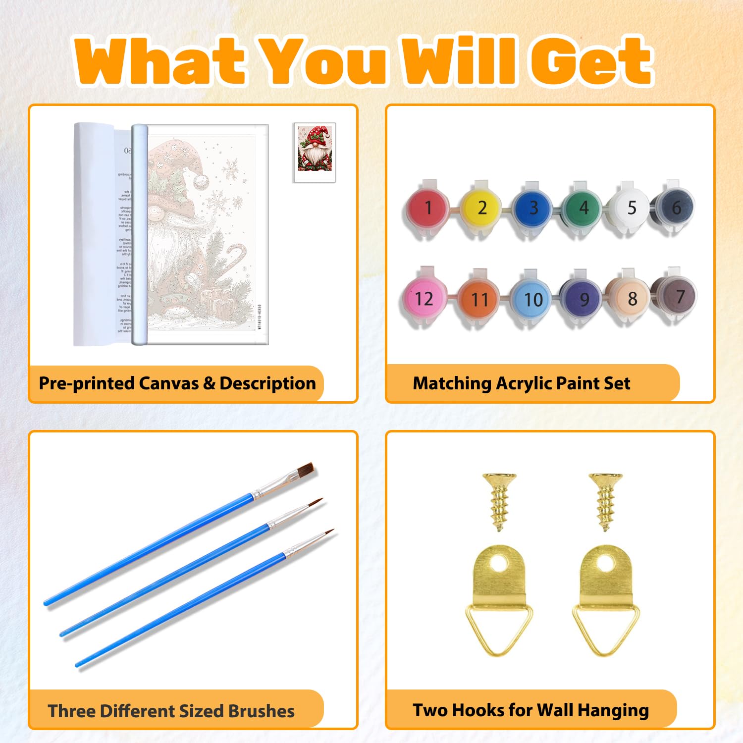 - Paint by numbers kit: Our christmas paint by numbers kit for adults beginners comes with everything you need: 1x waterproof canvas, 1x matching paint, 3x nylon brushes (different sizes), 1x line drawing, 1x instruction manual, 1x finished effect card, 2x metal hooks (No frame)