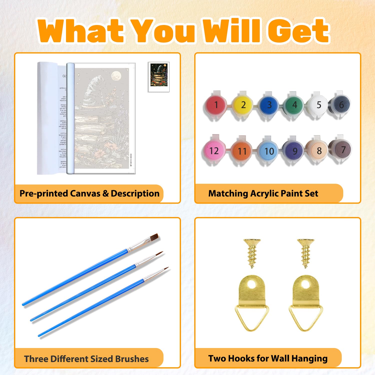 - Paint by numbers kit: Our book paint by numbers kit for adults beginners comes with everything you need: 1x waterproof canvas, 1x matching paint, 3x nylon brushes (different sizes), 1x line drawing, 1x instruction manual, 1x finished effect card, 2x metal hooks (No frame)