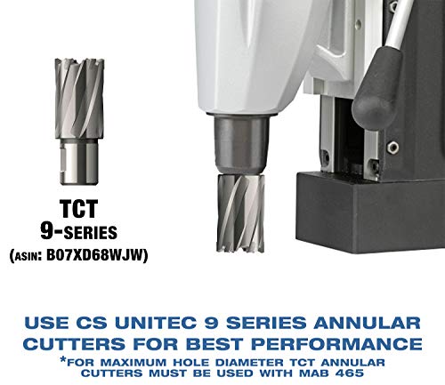 Details: "MAB 465 magnetic drill press is a powerful. reliable and economical variable-speed, reversible portable magnetic drill designed for demanding fabrication and continuous use. Compact, Lightweight and Maneuverable: -The MAB 465 mag drill cuts holes up to 2"" dia*. with tungsten carbide tipped annular cutters, up to 5/8"" dia. with twist drill bits, fully reversible for tapping up to 5/8"" dia. (M 16). Lightweight at 29 lbs. with 1150W of power -Handles can be swapped to either side, handles are fully removable for drilling in compact spaces -Overall height 14-1/8"", magnet footprint 6"" by 3-1/3"" -Variable-speed 2-Gear gearbox with 50-250/100-450 rpm load speed range for increased cutter life and speed control while tapping. -Through spindle integrated coolant delivery, extends cutter life and increases drill press cutting speed - Easy Guide adjustment - SAFEMAG: Electronic safety shut-off, automatically shuts down the drill motor if the magnet loses contact with the material. COOLMAG - Extends magnet life by preventing overheating. This features help protect both the operator and equipment as well as extend tool life. Full Specifications: -10.5 Amp/110 Volt Motor, 29 lbs., 2” diameter hole capacity*, 5/8” Twist Drill capacity, 5/8"" Tapping capacity, 1-1/2"" Countersinking Capacity, Variable Speed 50-250/100-450 RPM, 6-5/8” L x 3-1/3” W Magnetic Base, 14-1/8” H x 9-5/8”L x 6-1/2” W, 3750 lbs. magnetic force (on 1"" thick plate), ¾” Weldon Shank. Included Equipment: (1)Carrying case, (1) 3/4"" Weldon shank tool holder (affixed), (1) gravity feed lubrication system and removable reservoir, (1) safety strap carabin hook, (2) Allen keys, (1) 1"" pilot pin, (1) 2"" pilot pin. Click on the CS Unitec links to see our quality annular cutters and our full selection of magnetic drill presses. * 2 Inch cutting diameter is with TCT annular cutters, maximum cutting diameter is 1-5/8"" for all other annular cutters."