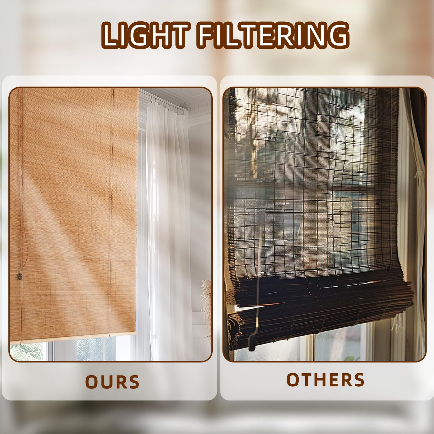 - 【Light Filtering】Designed with uniform thickness, meticulous workmanship, fine lines, and small gaps, our Bamboo Roll Up effectively filters sunlight and creates a soft, gentle light. Available in a variety of sizes to accommodate your needs, these Bamboo blinds are perfect for blocking out the sun's rays or creating a cozy atmosphere