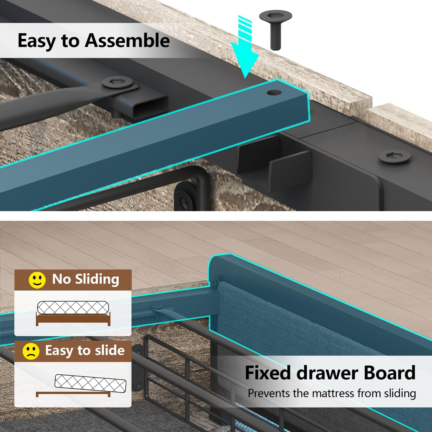 Constructed with durability in mind, this bed frame features 13 robust metal slats and 11 sturdy metal legs, including 5 adjustable central support legs. Designed to hold up to 1,100 lbs, it eliminates the need for a box spring. Experience peaceful nights with the EVA sound-absorbing strips under the centre bar, which prevent any annoying metal-on-metal noise, ensuring a distraction-free sleep environment.