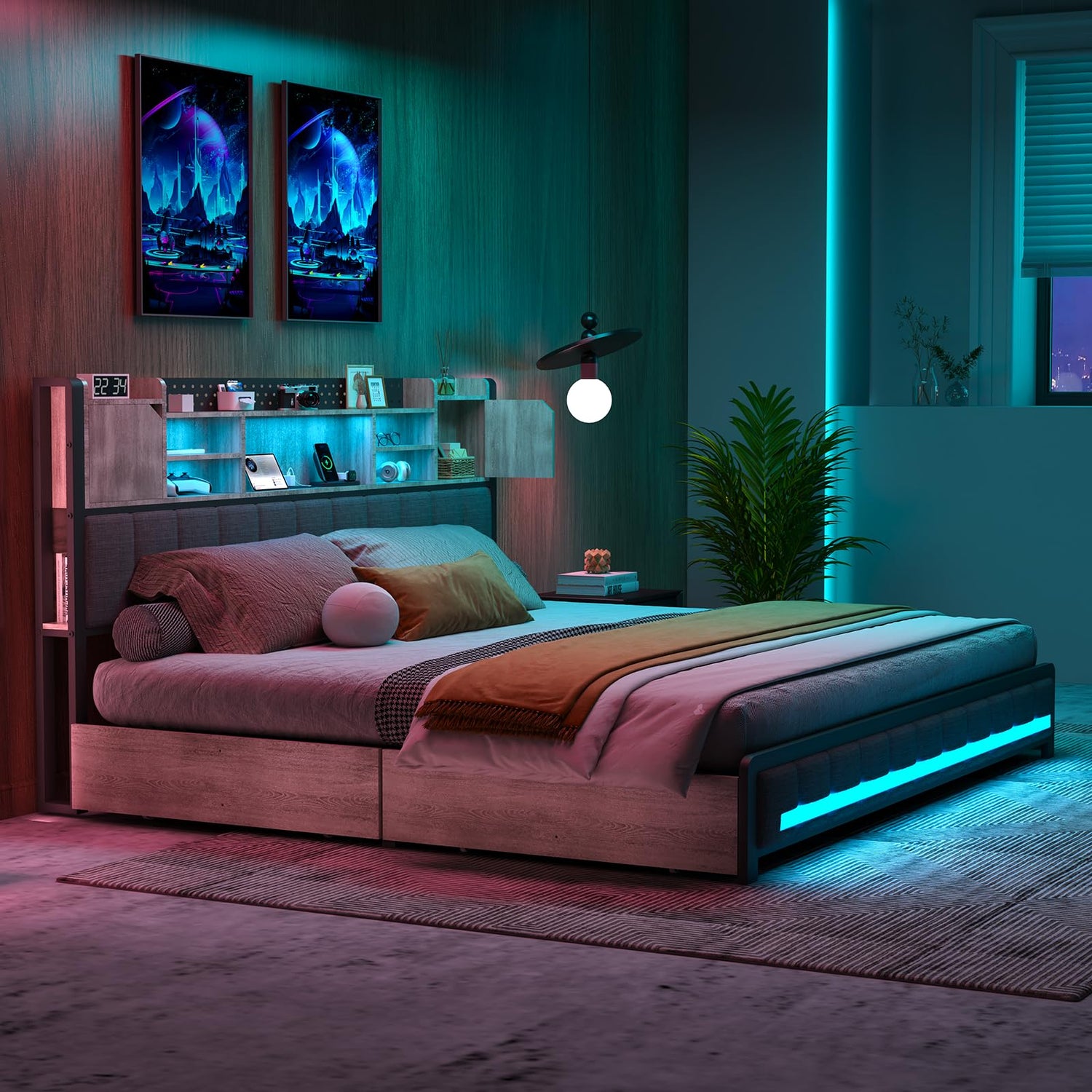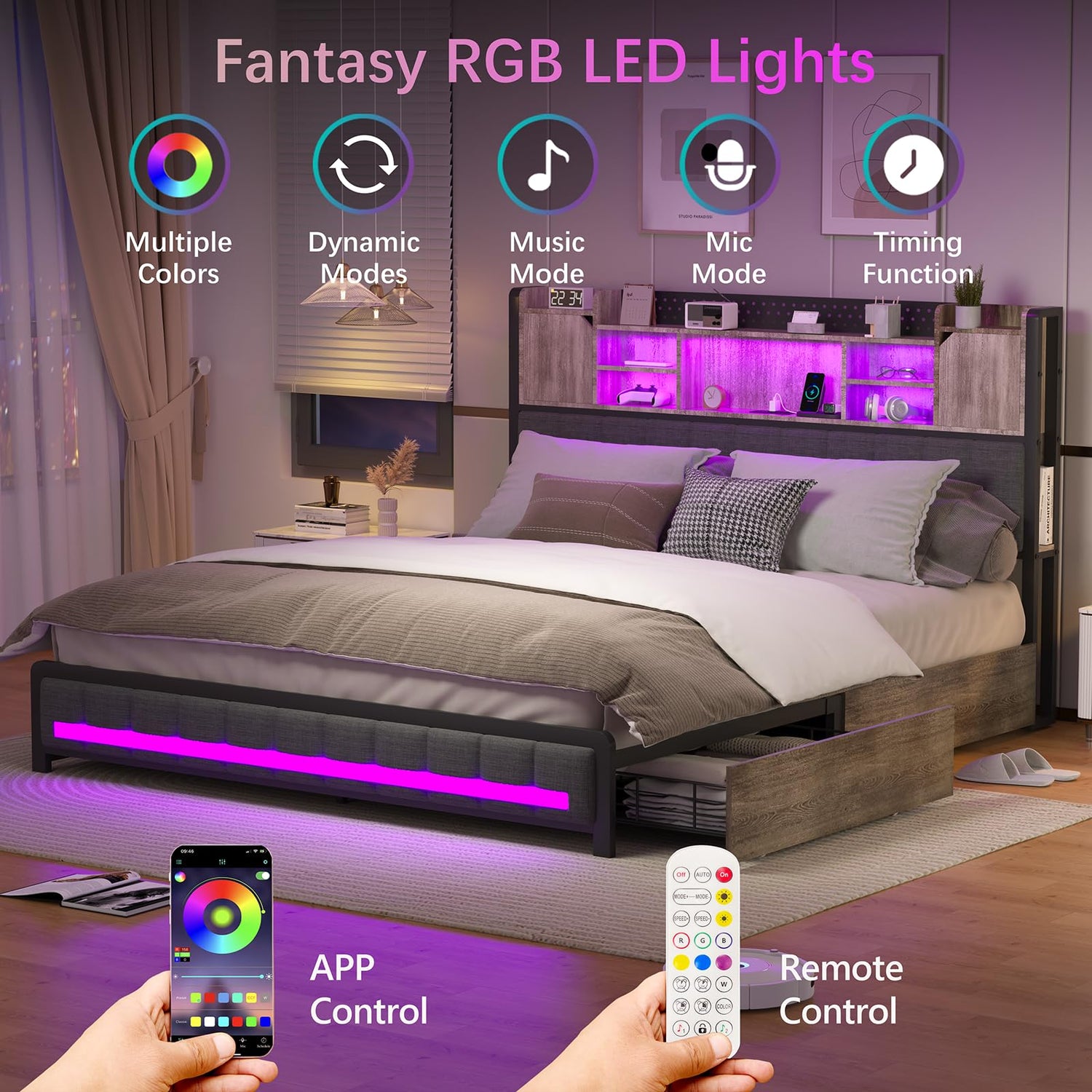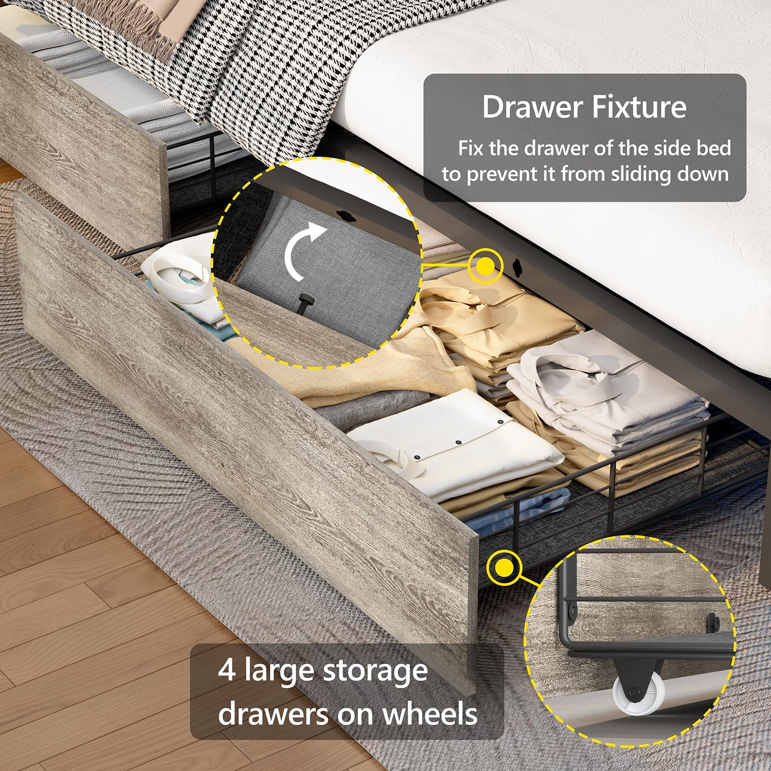 CSZZD Full Bed Frame with 4 Storage Drawers, Bookcase Headboard & USB Charging Station, Upholstered Metal Platform Bed in Oak Gray