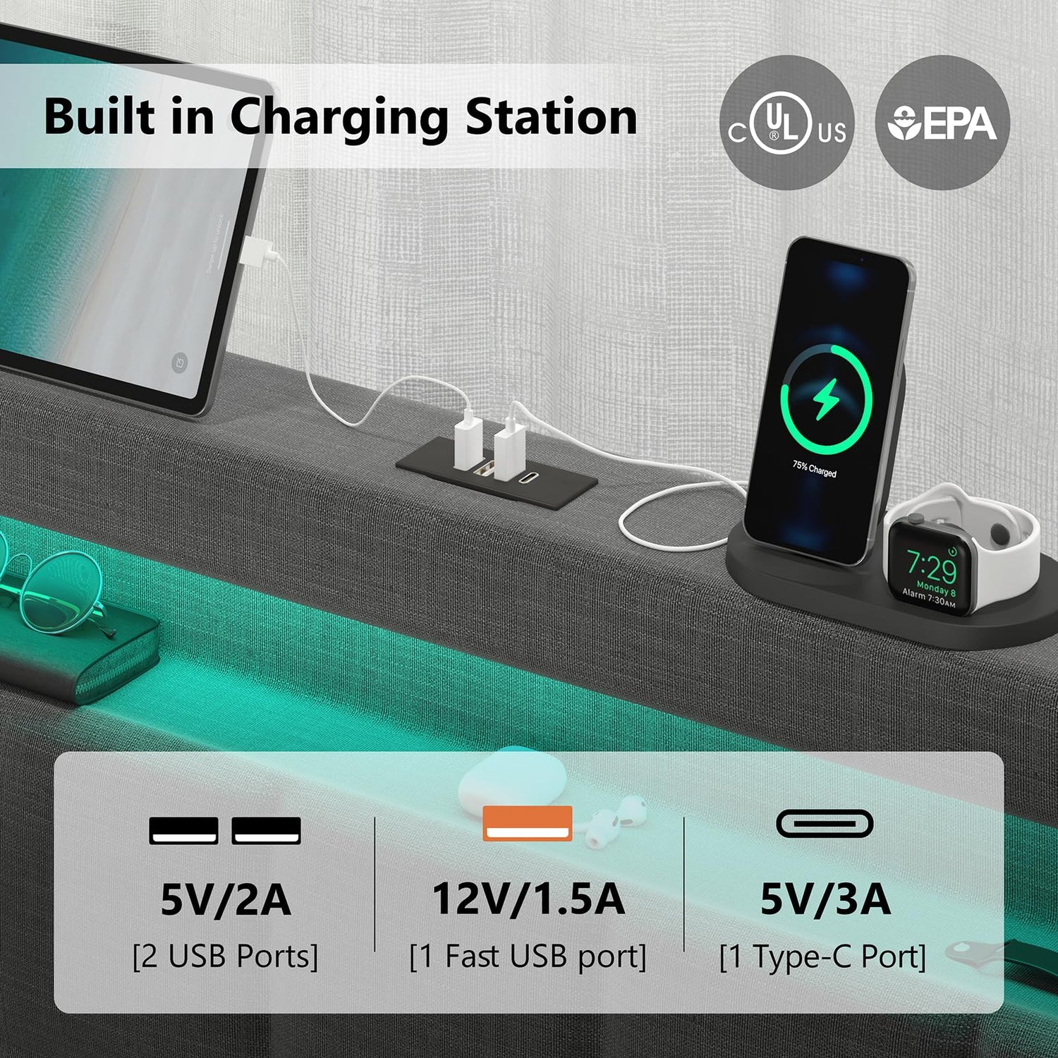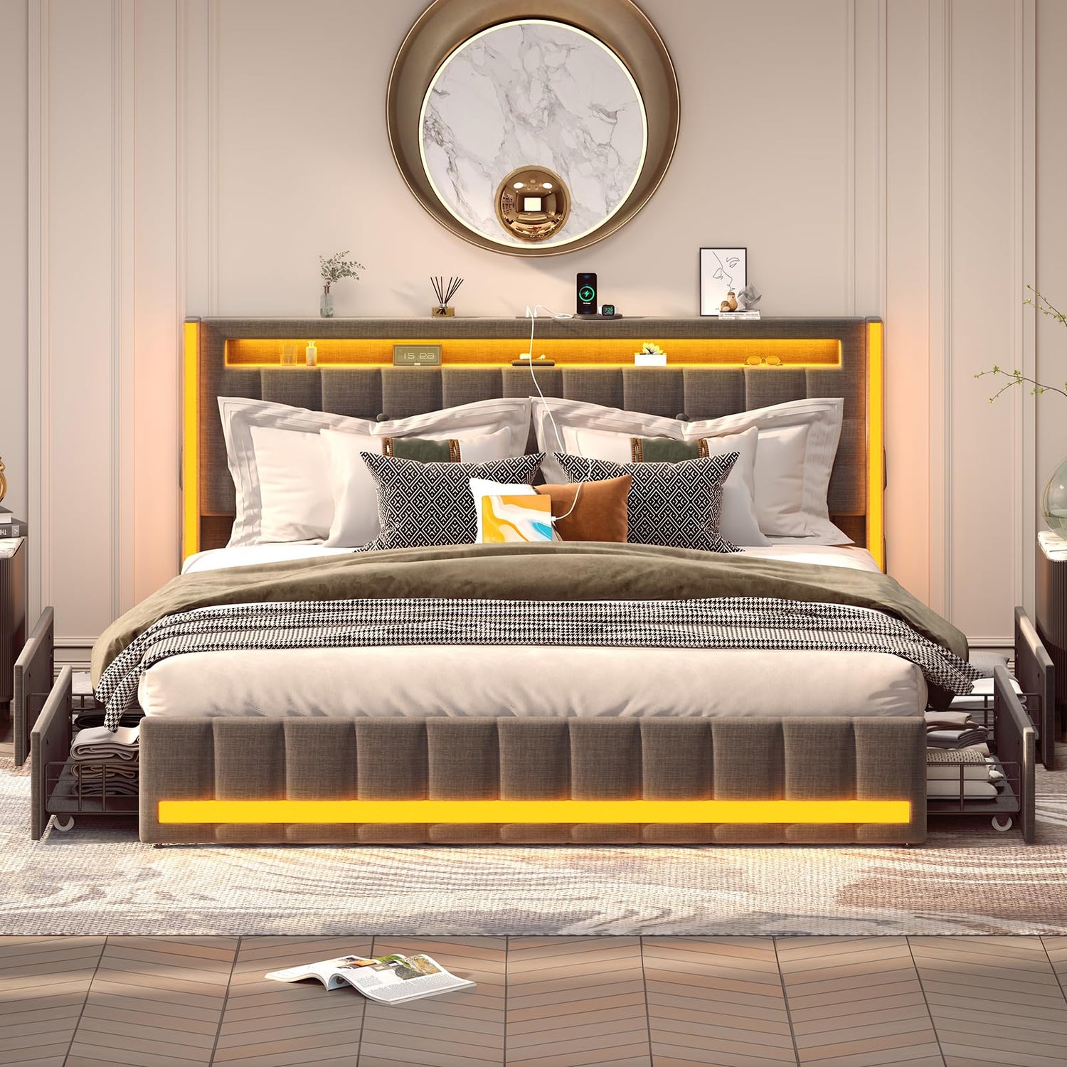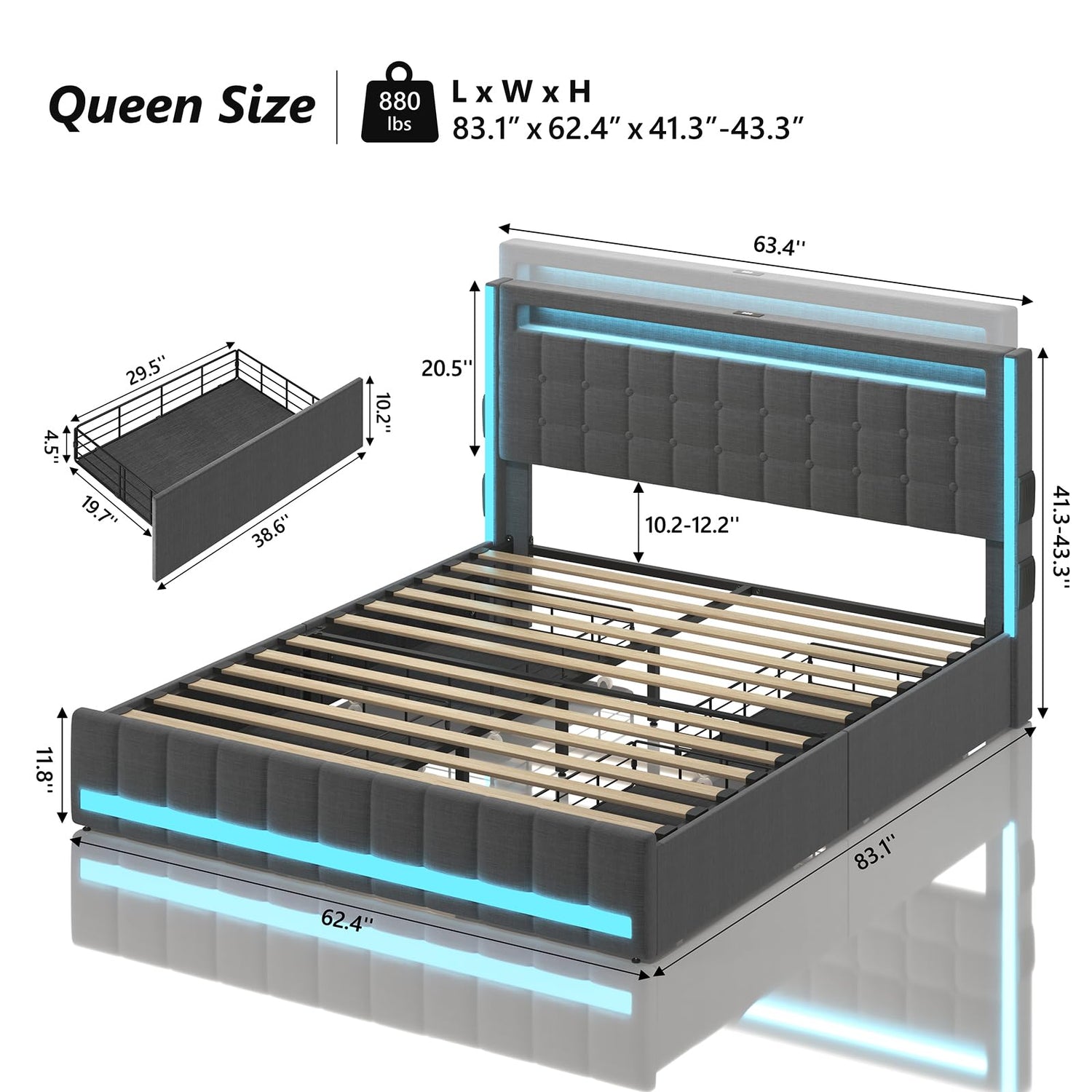 CSZZD Dark Grey Queen Bed Frame with LED Lights, Charging Station & 4 Storage Drawers