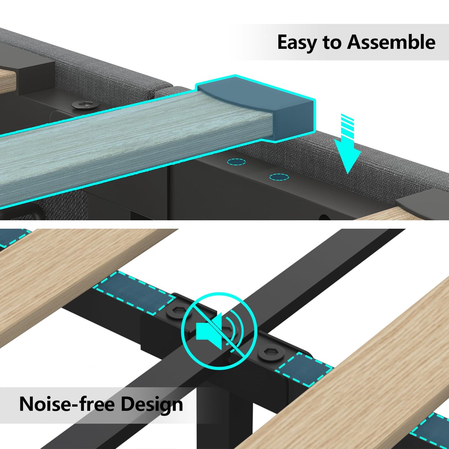 Constructed with a robust steel frame and a durable wooden slat support system, the bed frame is designed for long-lasting stability and support. It can accommodate up to 880 pounds without needing springs or a mattress foundation, ensuring a noise-free and comfortable sleep experience.