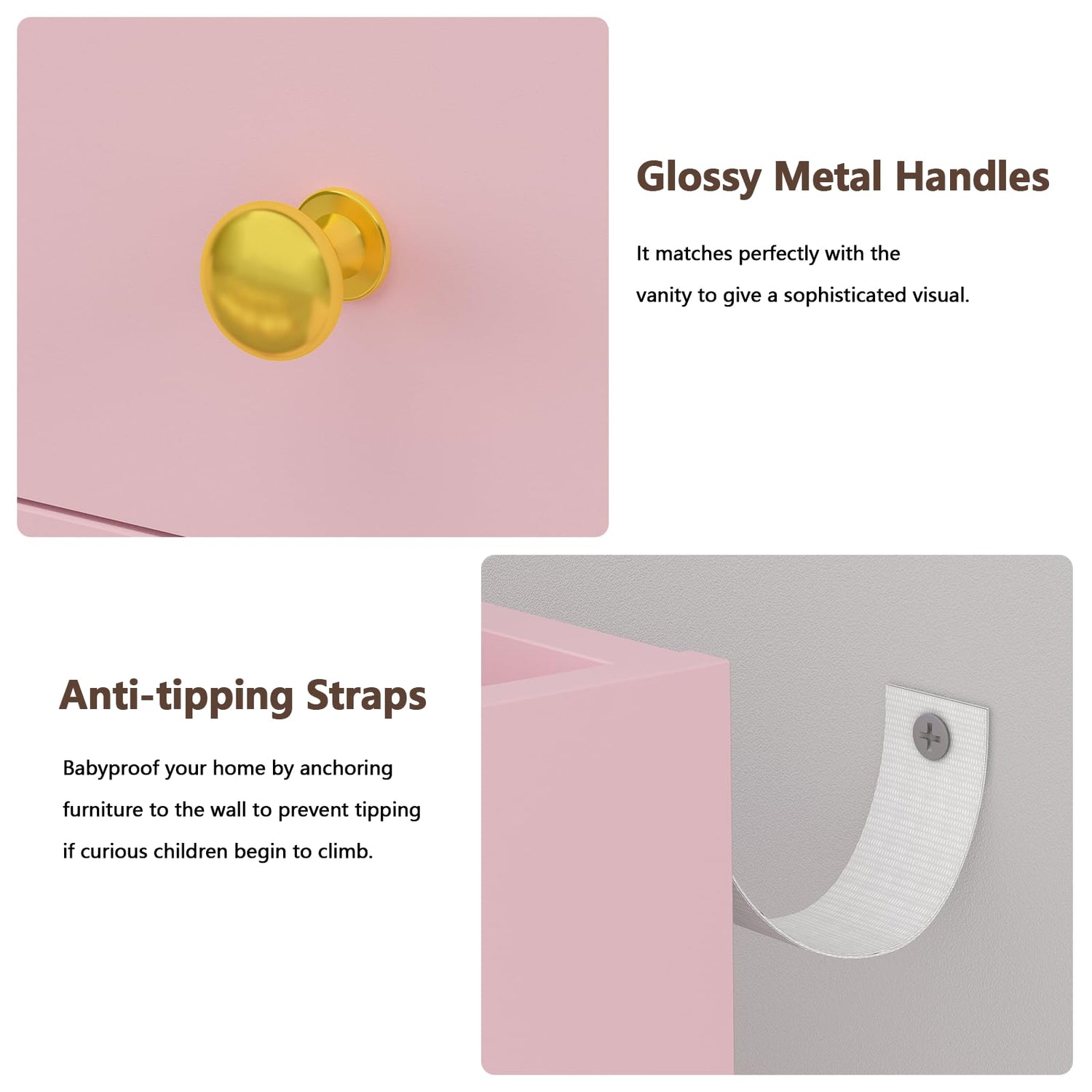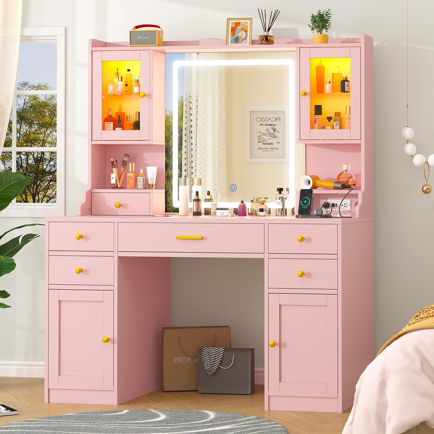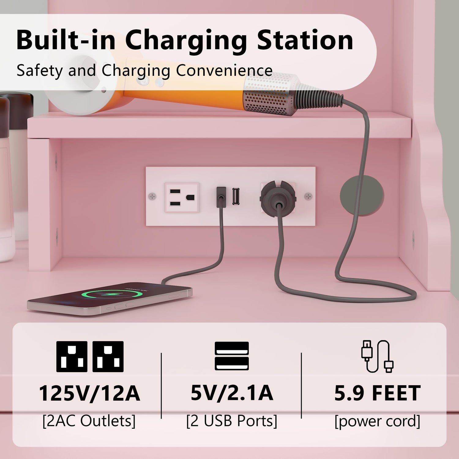 - 【Built-in Charging Station】This pink vanity desk comes with a power strip that includes 2 standard plug sockets and 2 USB ports, allowing you to sit at your vanity and use your hair dryer or curling iron within easy reach and charge your phone, tablet, or other electronics.