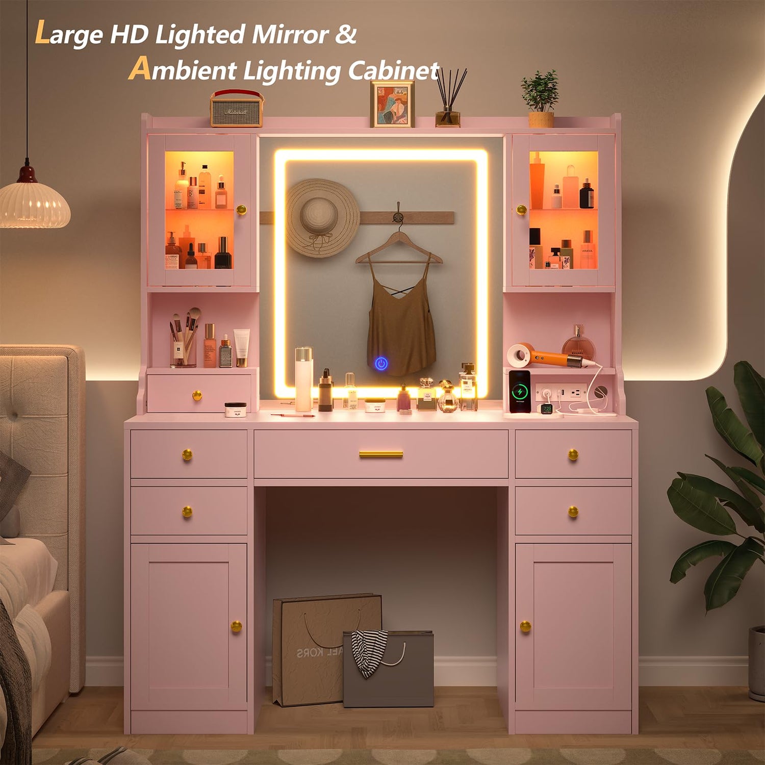 CSZZD Vanity Desk with LED Lighted Mirror, 41.3" Makeup Vanity Table with Power Outlet and Lots Storage, 6 Drawers and Storage Shelves for Bedroom, Dressing Table with RGB Cabinets, Pink