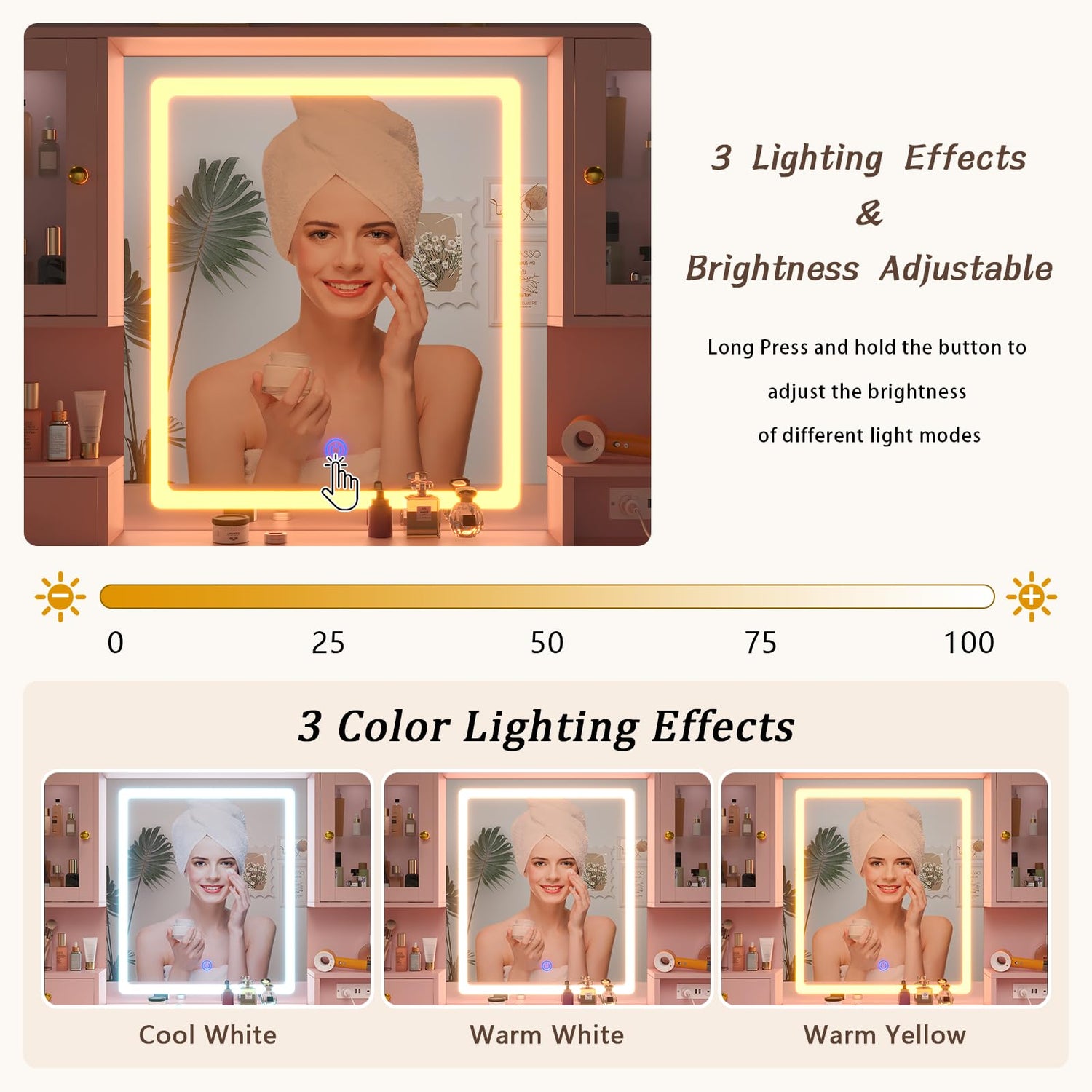 - 【Vanity Desk with Mirror and Lights】This vanity desk features a large LED mirror with 3 color modes (warm, natural, and cool), which is safer than ordinary light bulbs. You can change the color mode by pressing the touch switch, or adjust the brightness by long-pressing the touch switch. Just simply touch the switch and toggle the brightness for checking makeup, hairstyle, or taking photos,allowing you to enjoy makeup experience like a star!!
