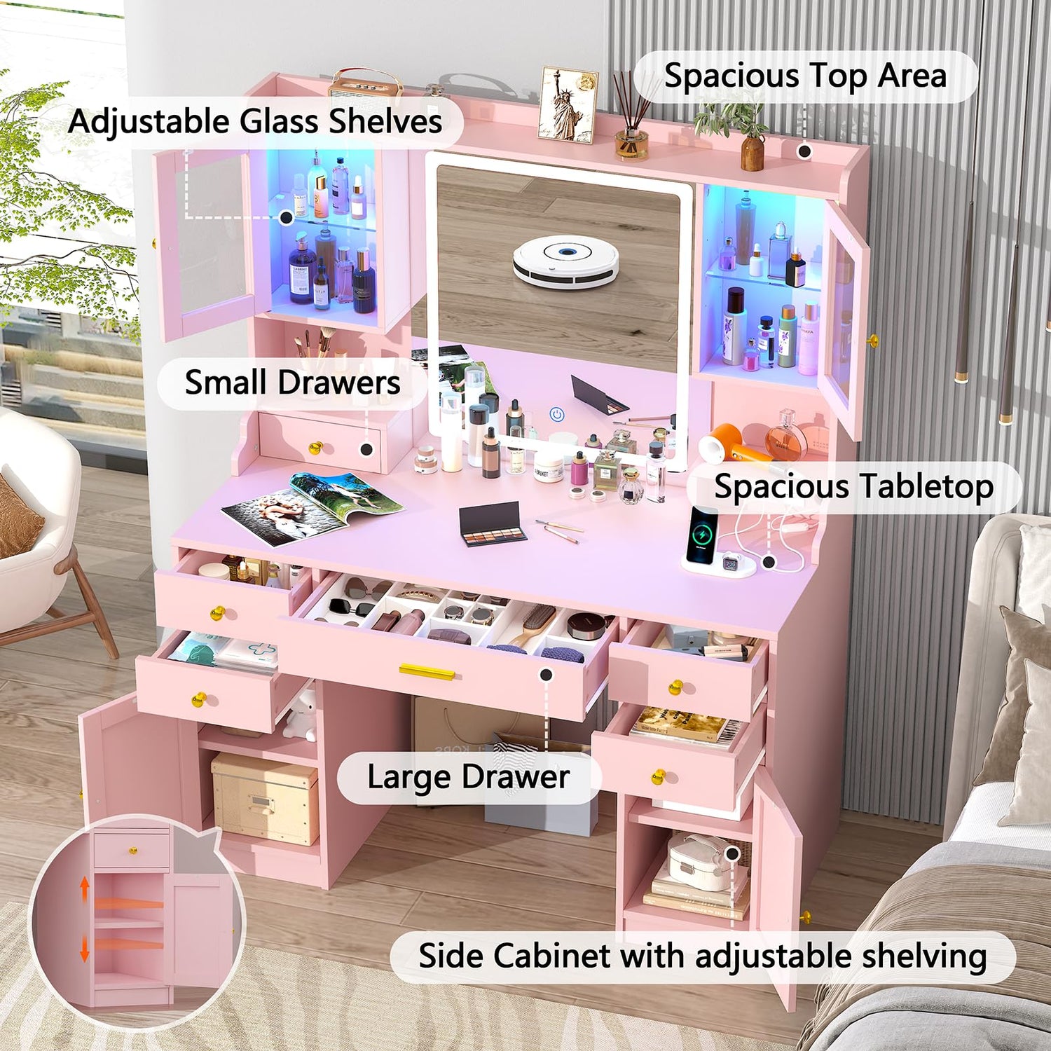 - 【Vanity Desk with RGB Cabinets】This makeup vanity is equipped with 2 cabinets with height-adjustable laminates and an RGB lighting system, which can be controlled via APP or a switch. With over 60,000 static colors available and multiple lighting modes, the system can synchronize to music for a stunning visual experience while you relax or entertain.