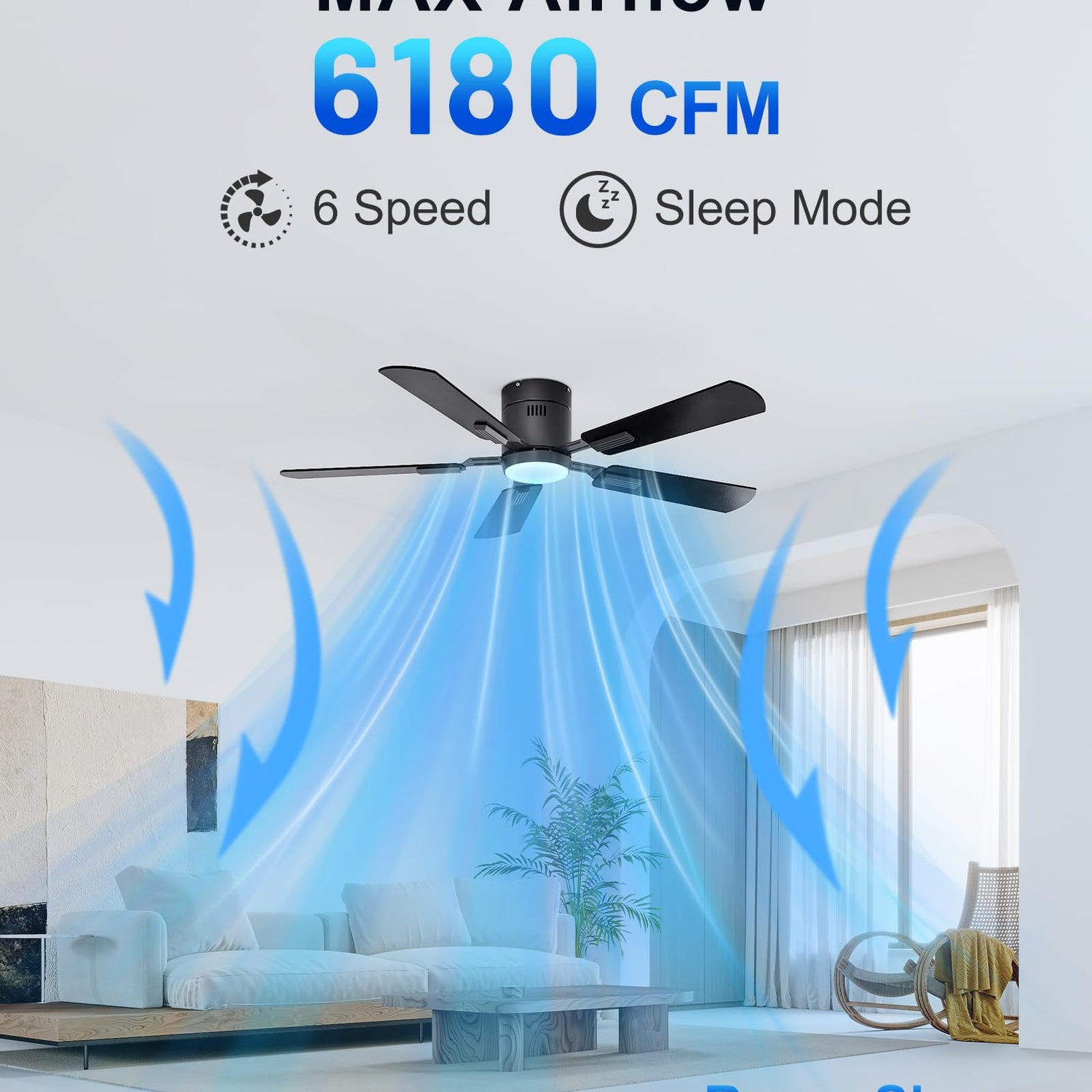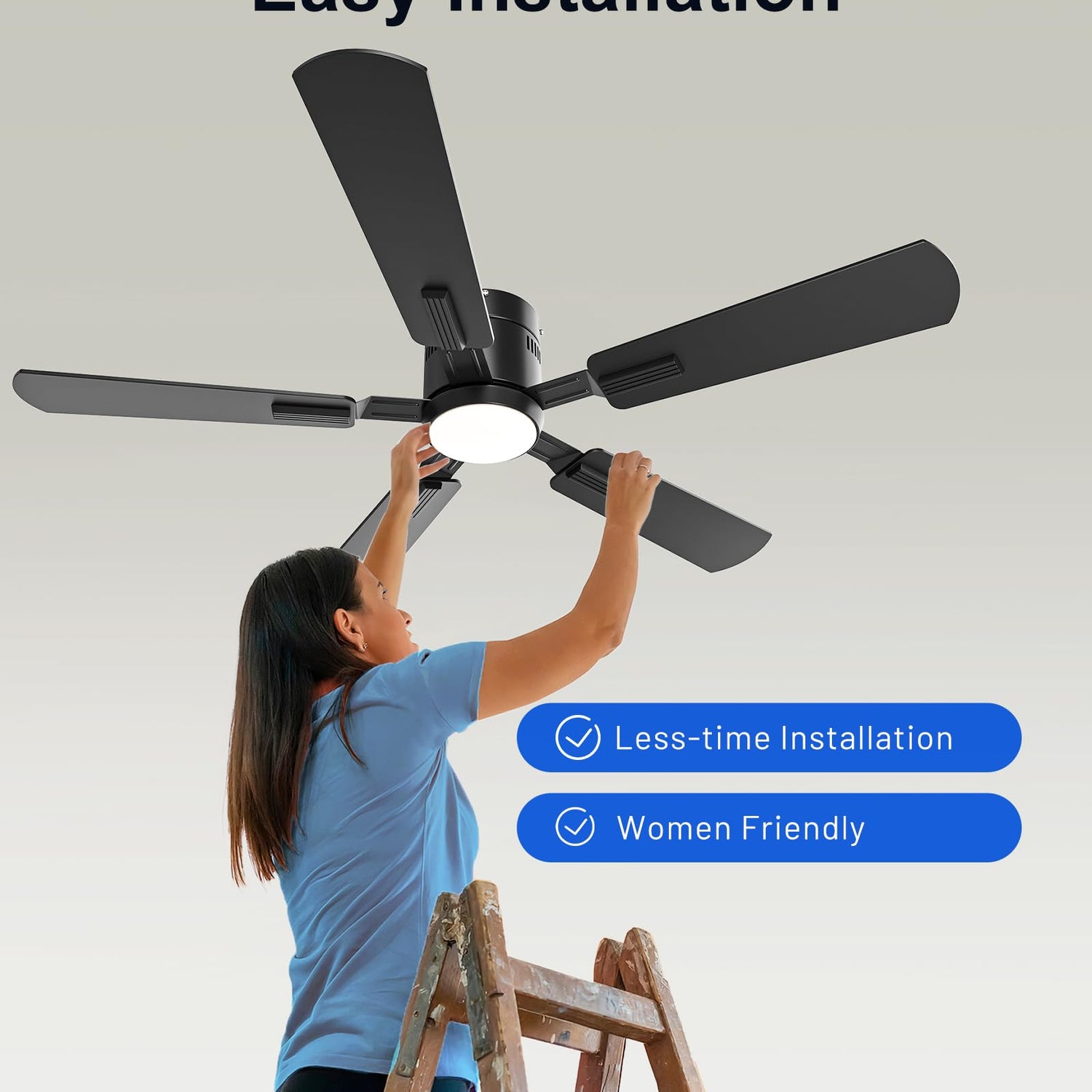 CubiCubi Ceiling Fan, 52" Low Profile Ceiling Fans with Lights and Remote/APP Control, Flush Mount, 5CCT, Stepless Dimmable, Super Quiet, 6 Speeds, Modern Ceiling Fans for Bedroom Living Room, Black