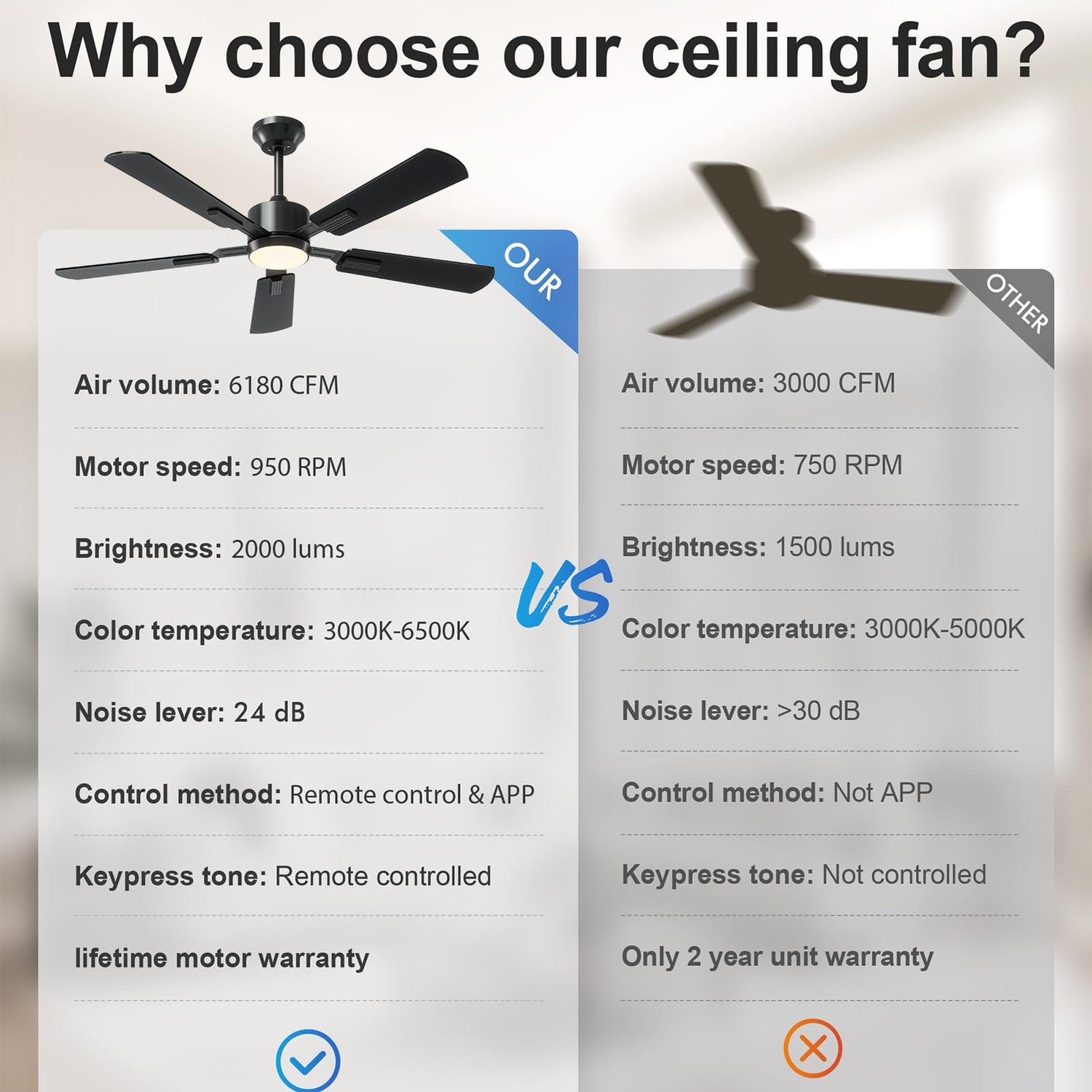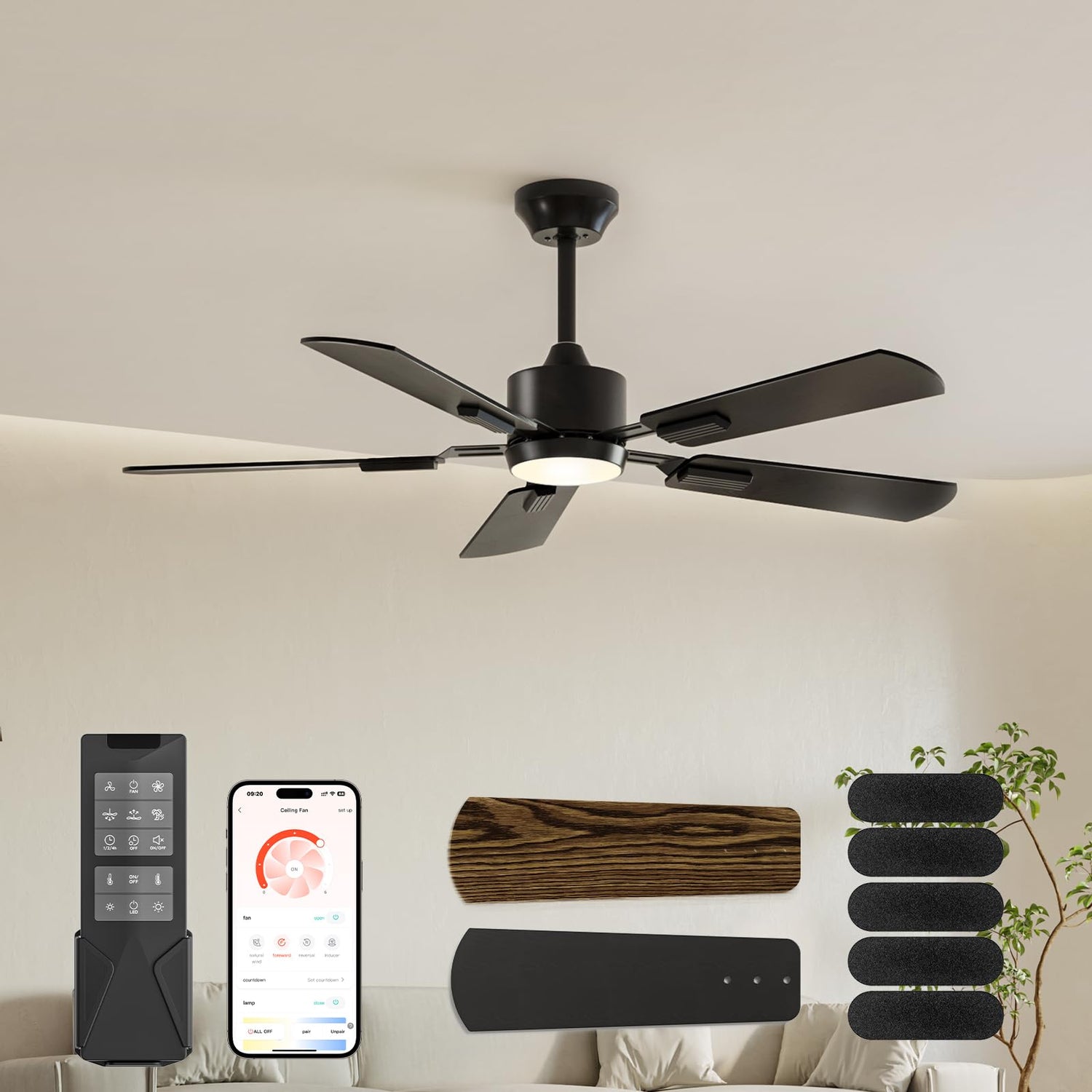 CubiCubi Ceiling Fans with Lights - 52 inch Black Ceiling Fan with Light and Remote/APP, Dimmable, Super Quiet, Modern Ceiling Fan for Indoor Bedroom, Living Room, Kitchen