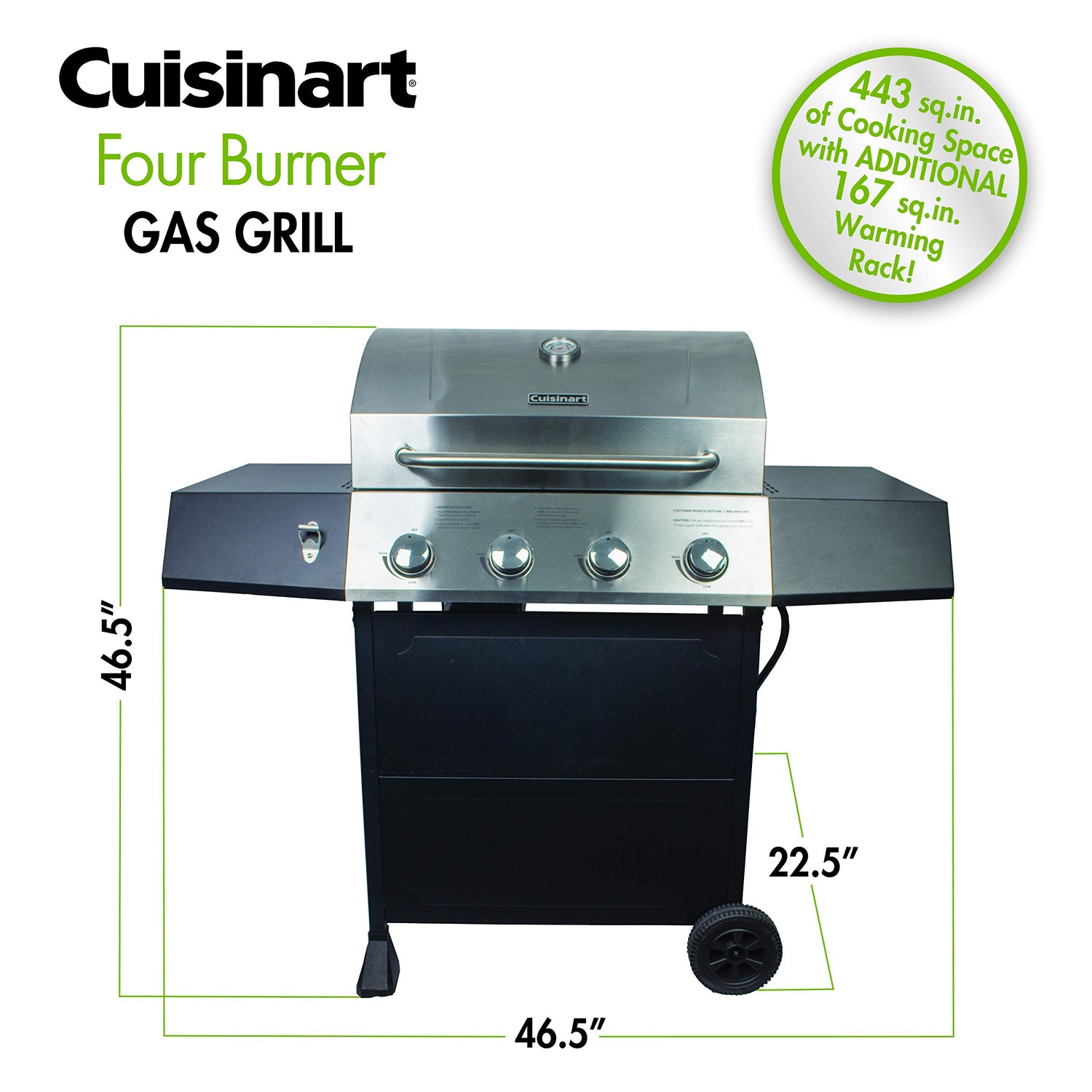 Details: The Cuisinart 4-Burner Gas Grill is exactly what you need for your home. Cuisinart’s first full-size grill is one that was built to last and built to impress. With its 4 individually controllable burners, you’ll get 44,000 BTUs of cooking heat spread evenly across the 443 square inches of cooking surface. And if you’re looking for additional space, there’s a built-in warming rack that provides 202 additional square inches. With an easy twist to start ignition and removable cast iron cooking grates, this grill was made with the customer in mind. And no full-size grill is complete without side tables. The Cuisinart 4-Burner Gas Grill has two 18-inch x 13-inch side tables that provide plenty of extra space during a cookout.
