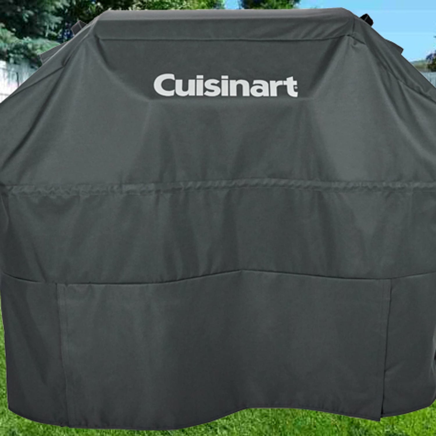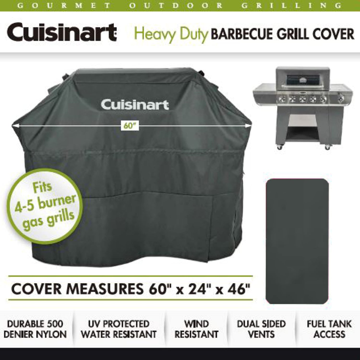 Details: Protect your grill from the elements with the Cuisinart Heavy-Duty Barbecue Gray 4-5 Burner Gas Grill Cover!The cover is UV protected, wind and water resistant and the dual sided vents dissipate excess heat and prevents condensation. The easy-access, resealable flap on the front allows for quick access to the propane tank. Buckle straps around the wheels and adjustable drawstrings on the sides anchor the cover to your grill in even the strongest winds. When it's time to grill, the dual sided grip handles allow for easy removal of the cover. The prestigious Cuisinart brand is not limited to their famous food processors - plugged or unplugged, nobody covers the modern chef like Cuisinart. Cuisinart is a full-service culinary resource with a wide array of products, preferred by chefs and favored by consumers. And now you can take the world famous Cuisinart brand to your patio, lawn, tailgate, or campsite with their comprehensive line of Cuisinart outdoor grilling products available now at Walmart.