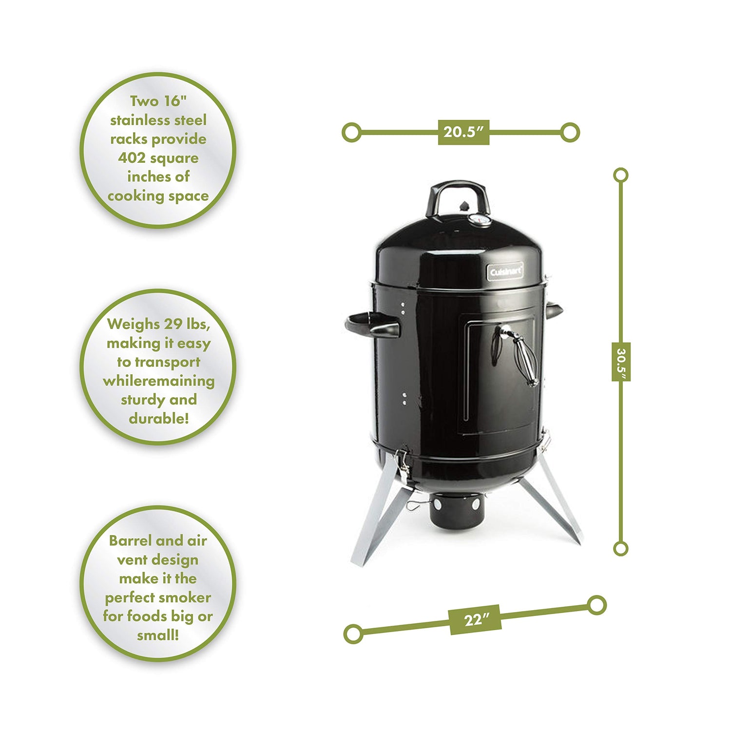 Details: The Cuisinart vertical 16" charcoal smoker was built to last. With two 16" solid steel cooking grates, this smoker can accommodate just about any food you're looking to smoke at the house. Working a charcoal smoker is as simple as lighting the charcoal, filling up the water bowl, & then casually adjusting the air vents to control the temperature. This vertical barrel design makes it easy to keep a consistent temperature with minimal adjustments & accessing the water bowl & charcoal grate doesn't get much easier with this vertically hinged door. When all you need to setup the Cuisinart vertical 16" charcoal smoker is 15 Min & a screwdriver, you'll be smoking your favorite foods in no time!