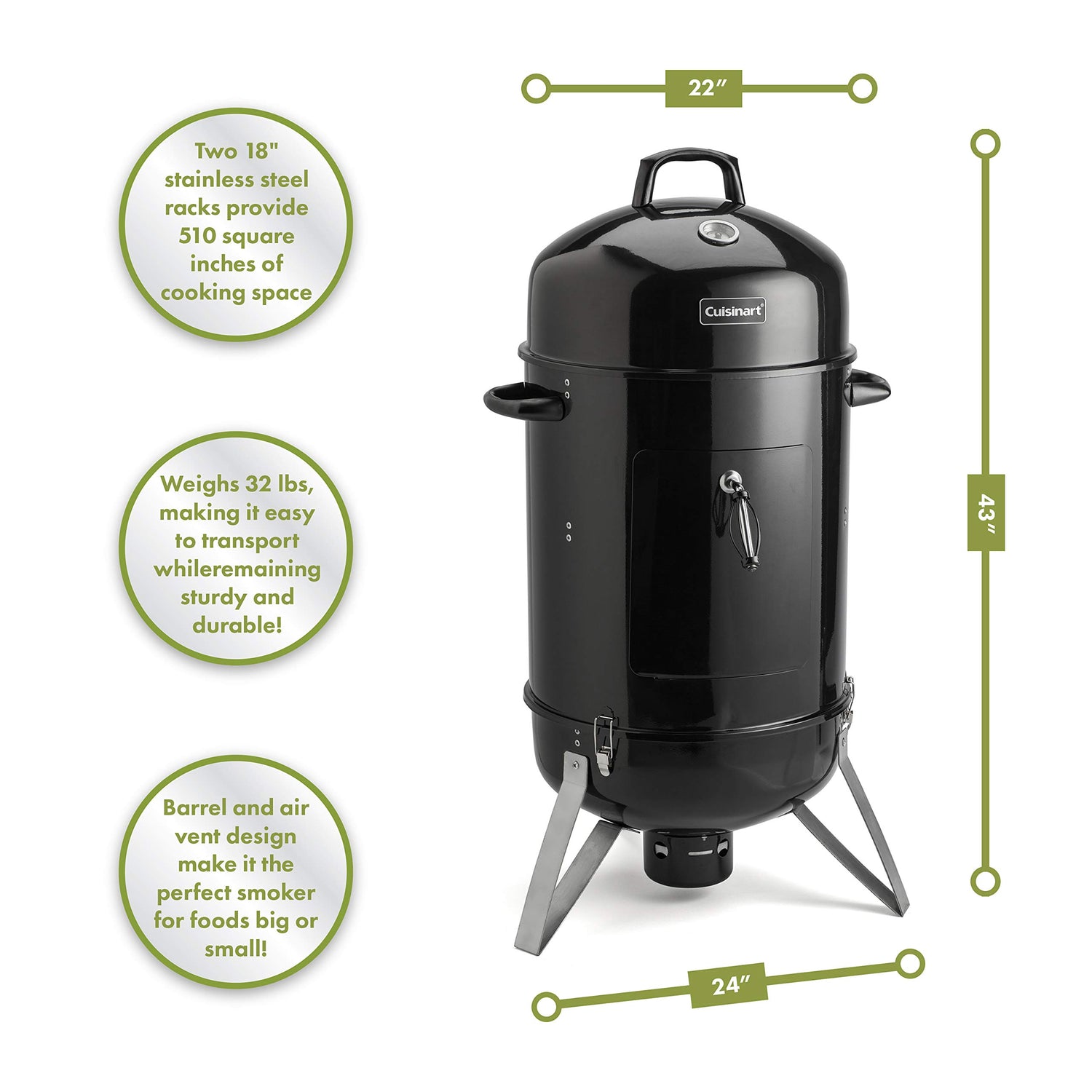 Details: The Cuisinart Vertical 18" charcoal smoker was built to last. With two 18" solid steel cooking grates, this smoker can accommodate just about any food you're looking to smoke at the house. Working a charcoal smoker is as simple as lighting the charcoal, filling up the water bowl, & then casually adjusting the air vents to control the temperature. This Vertical barrel design makes it easy to keep a consistent temperature with minimal adjustments & accessing the water bowl & charcoal grate doesn't get much easier with this vertically hinged door. When all you need to setup the Cuisinart Vertical 18" charcoal smoker is 15 Min & a Screwdriver, you'll be smoking your favorite foods in no time!