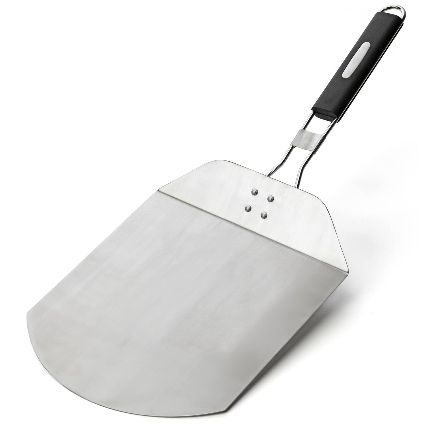 - PIZZA PEEL: Folding handle stainless pizza peel stores easily