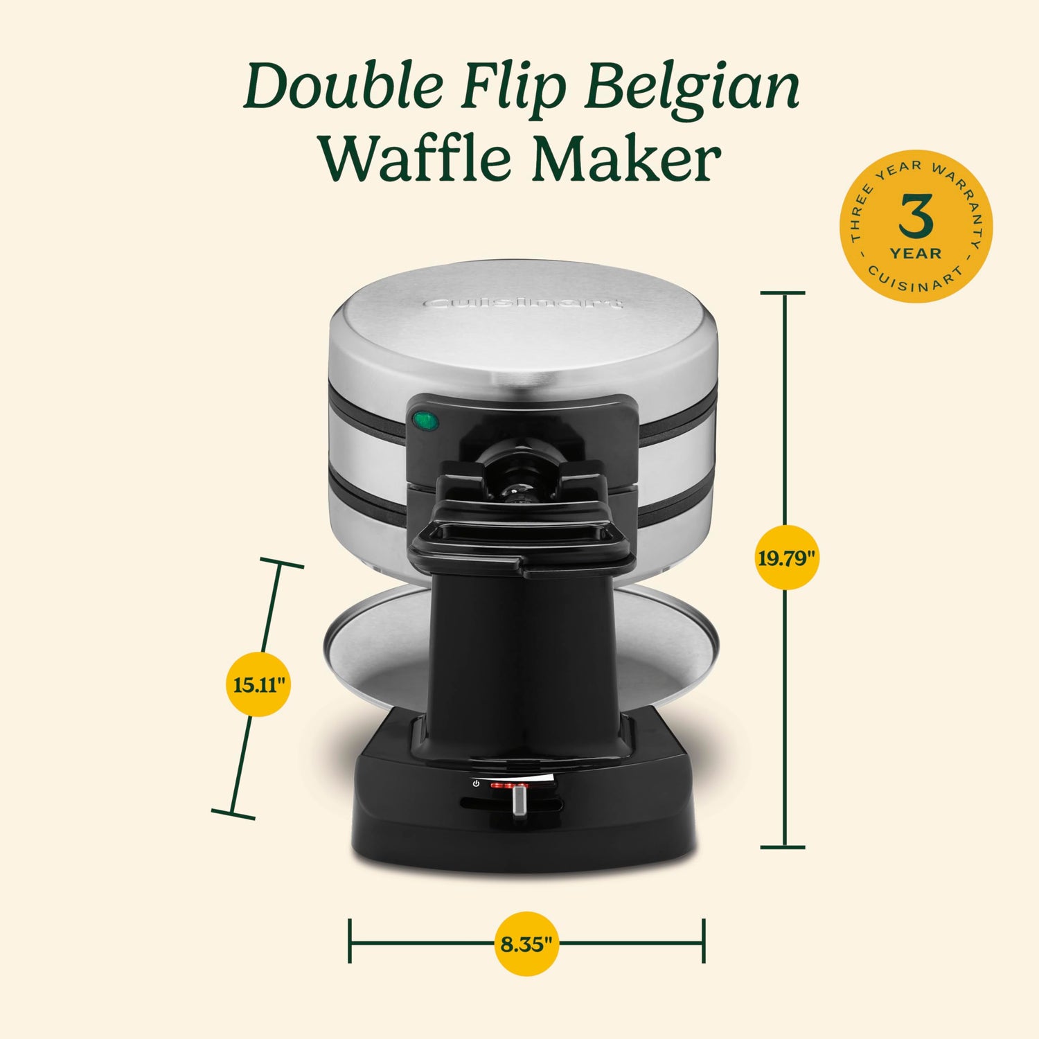 Details: Cooking two Belgian waffles at a time to perfection is easy with Cuisinart’s Double Belgian Waffle Maker. The distinctive rotary feature flips 180° to evenly cook them inside and out. Powered by 1400 watts, this innovative kitchen essential cooks Belgian waffles in minutes, with turn-of-the-dial controls to bake them according to preference, from light and fluffy to brown and crispy. To prevent over- or under-cooking, a ready indicator light and beeping alert announce when waffles are ready. Nonstick plates ensure flawlessly formed, deep pocketed Belgian waffles release easily onto the plate, ready for a wide variety of toppings, from fruits and meats to jams and whipped cream. Durable, brushed stainless steel housing adds a sleek, modern touch to any kitchen and wipes clean in seconds.