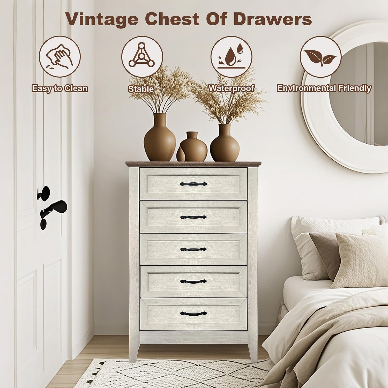 - Durable & Stable: Rustic wooden 5 drawer is crafted from sturdy wood and engineered wood, ensuring its durability and stability.The widened metal matte handles enhance aesthetics and provide a comfortable grip. The thickened tabletop withstands heavier weights without deformation or damage. The heightened base enhances stability for safe and reliable use.
