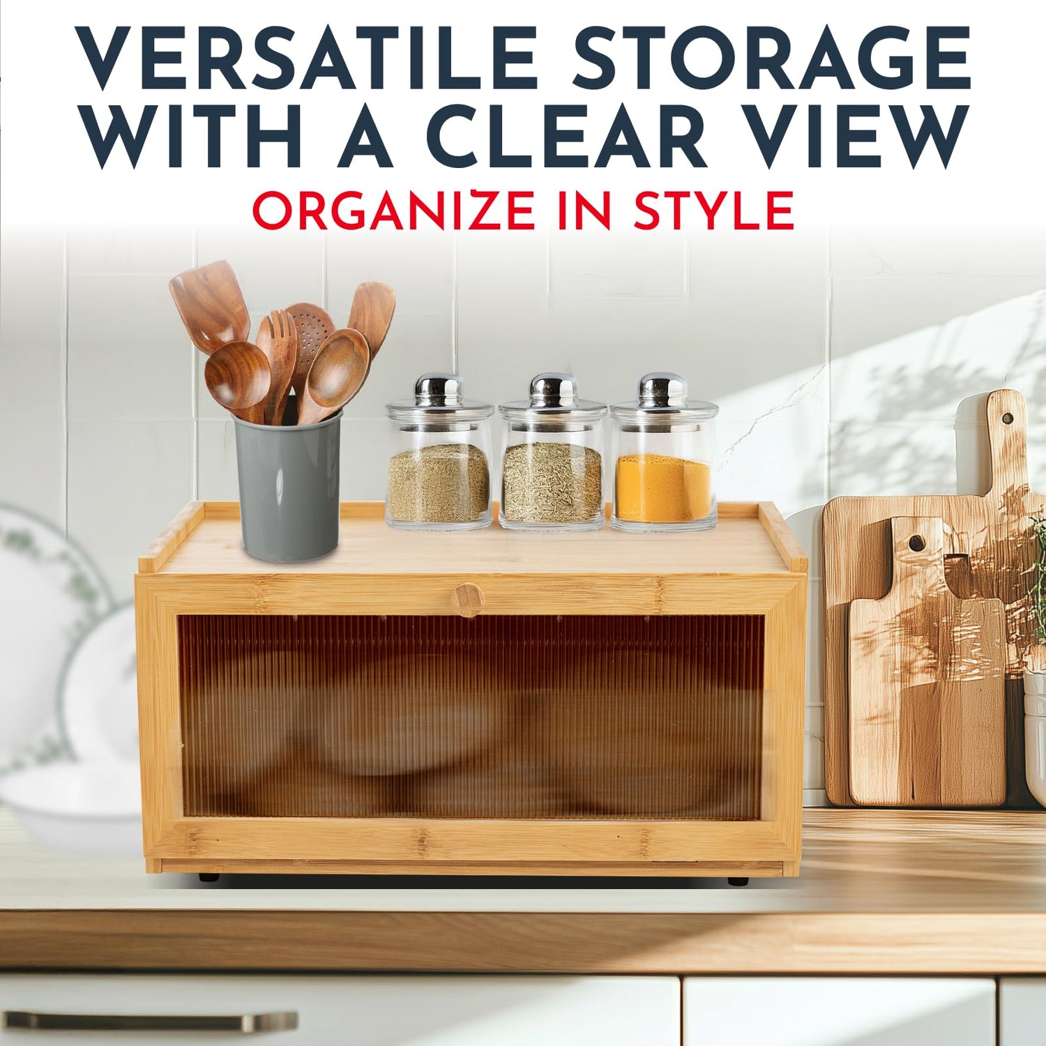• Flat-Top Design – Double the Storage Our bread box comes with a flat-top surface that allows you to maximize your space. Use the top to store jars, cookbooks, or kitchen tools, while the raised edges prevent items from slipping off.