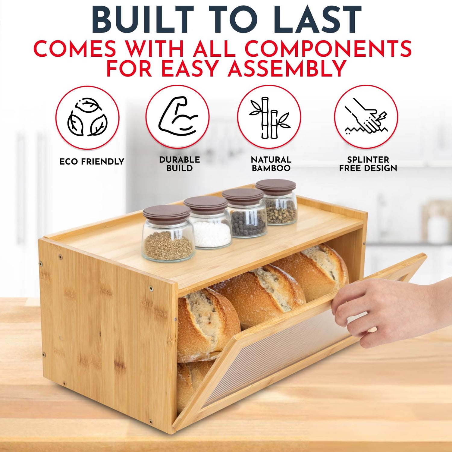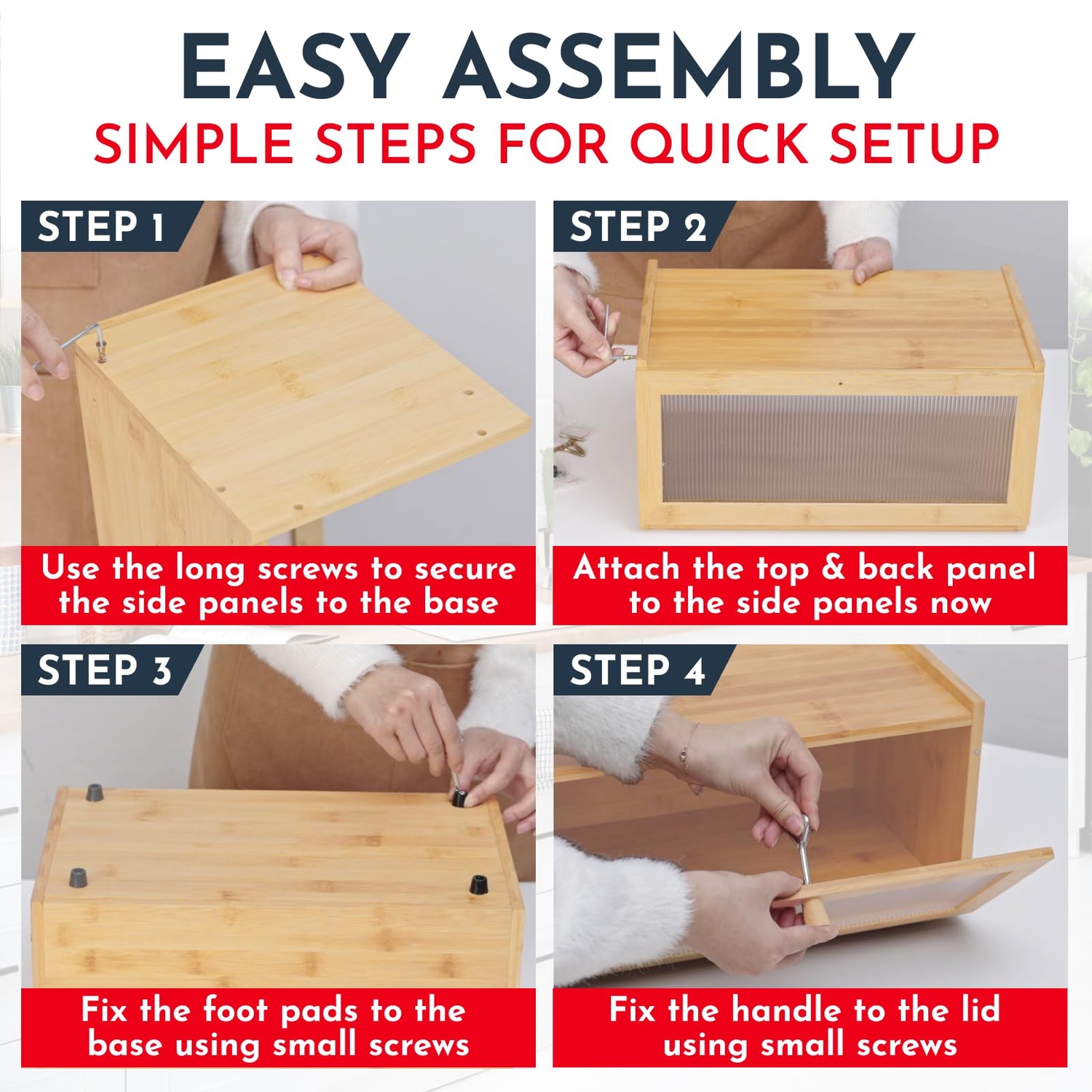 • Effortless Assembly – Ready in Minutes No complicated tools or hours of frustration – our bread box features a 5-board design and can be assembled in just 5 simple steps.