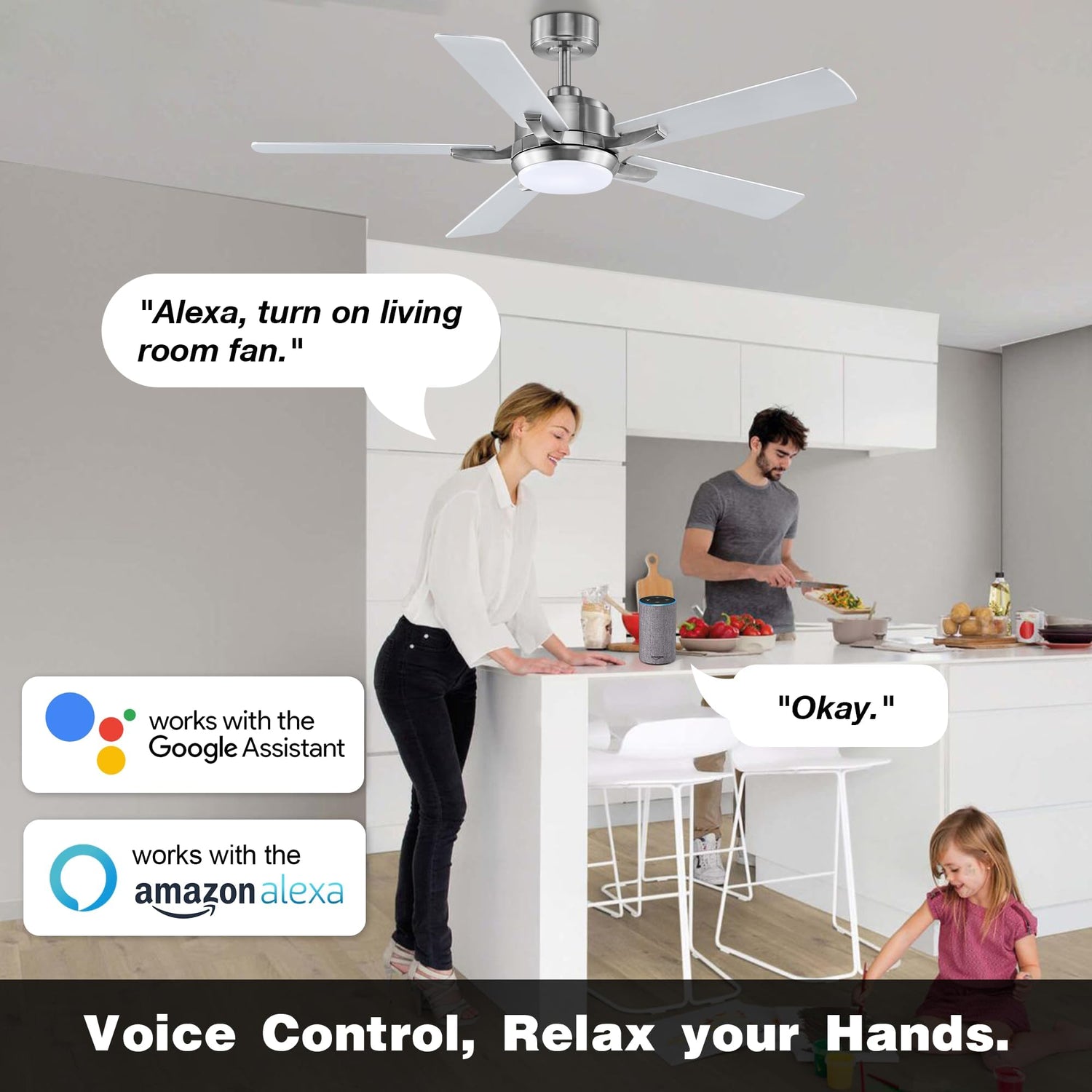 - 【Voice &Phone &Remote Control】52 inch Ceiling fan with lights remote control (handheld and wall mounted), still in control when WiFi doesn’t work. Voice enabled ceiling fans with smart control are compatible with WIFI, Alexa, Google and App, just control via simple voice command “Alexa/Google, turn on the fan in the bedroom or on the patio” or phone App from anywhere.