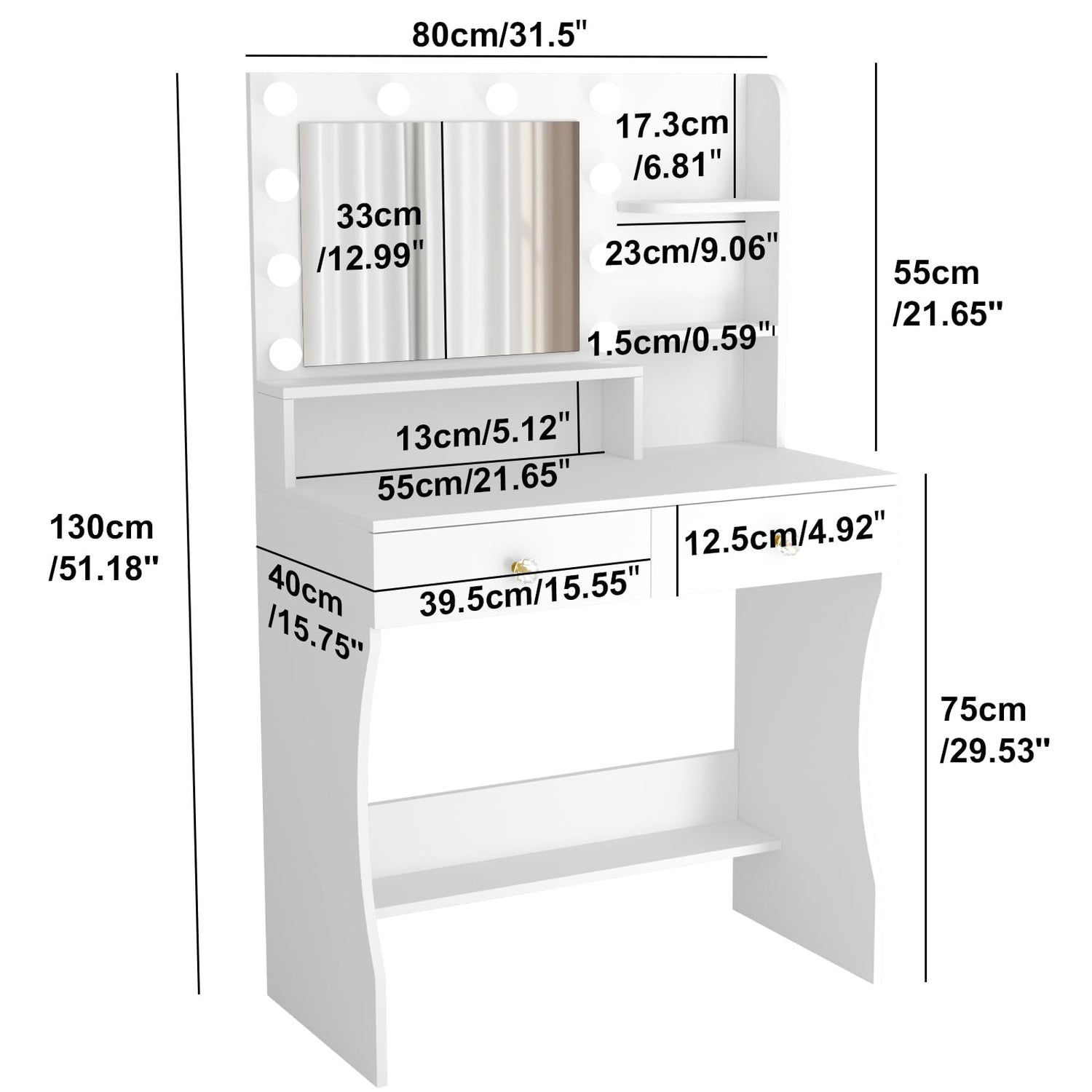 - 【Elegant & Modern Design】:Our vanity desk with mirror and lights features a sleek, all-white finish that effortlessly complements any home decor. The smooth surface, paired with sophisticated diamond-like handles, gives this white vanity a chic, modern flair that enhances any bedroom or dressing space. Whether you're treating yourself or surprising a loved one with a thoughtful gift, this white vanity with lighted mirror is sure to impress. The 1.5cm thick wood panels offer superior durability compared to other makeup vanity on the market, providing enhanced support without sacrificing style.