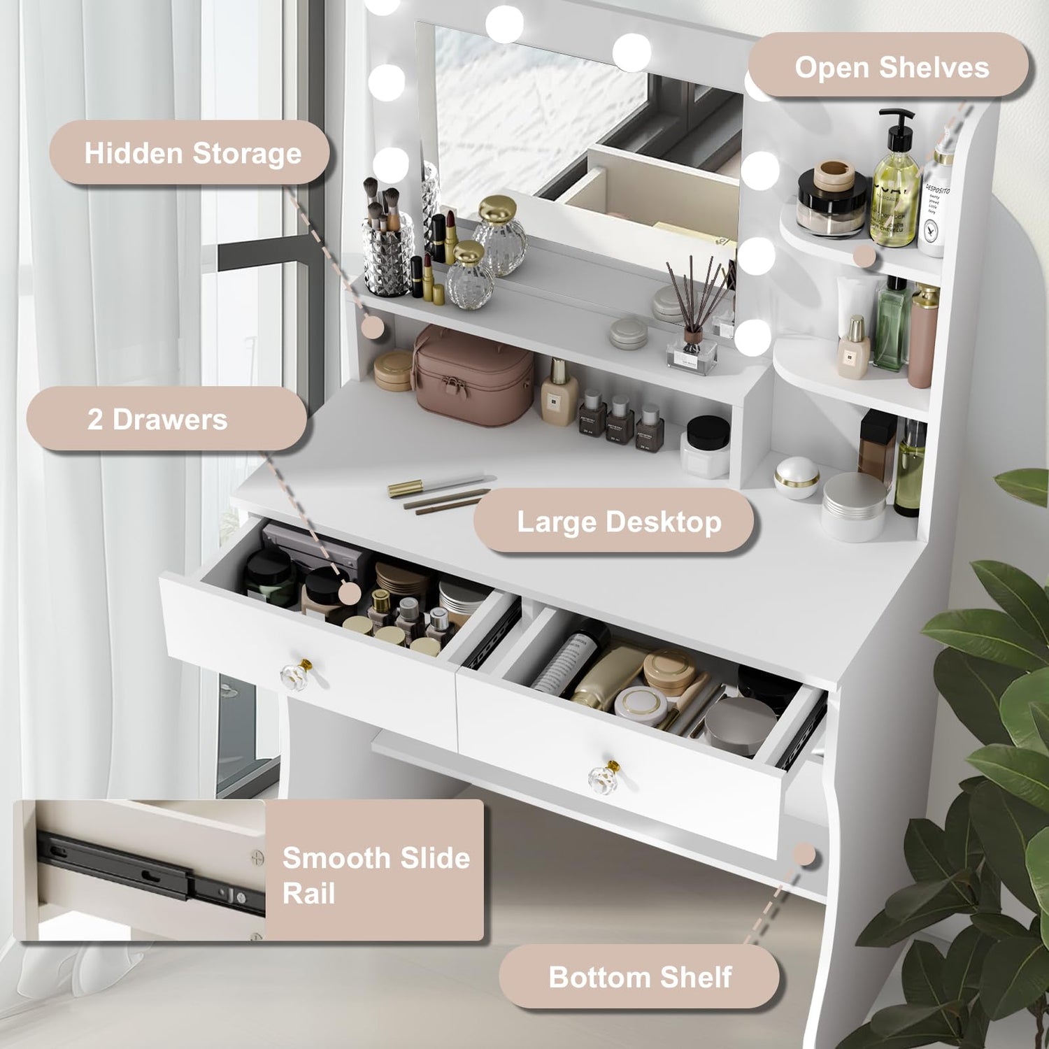 - 【Ample and Practical Storage】:Designed for functionality and organization, this vanity mirror with lights desk comes with two spacious drawers that can easily accommodate cosmetics, hair tools, magazines, and more. The innovative "L-shaped" base of get ready with me vanity not only offers a comfortable footrest but also serves as extra storage for small items like boxes or accessories you don't need to access often. The layout is carefully thought out to help you maintain a clutter-free space while keeping everything you need within reach.