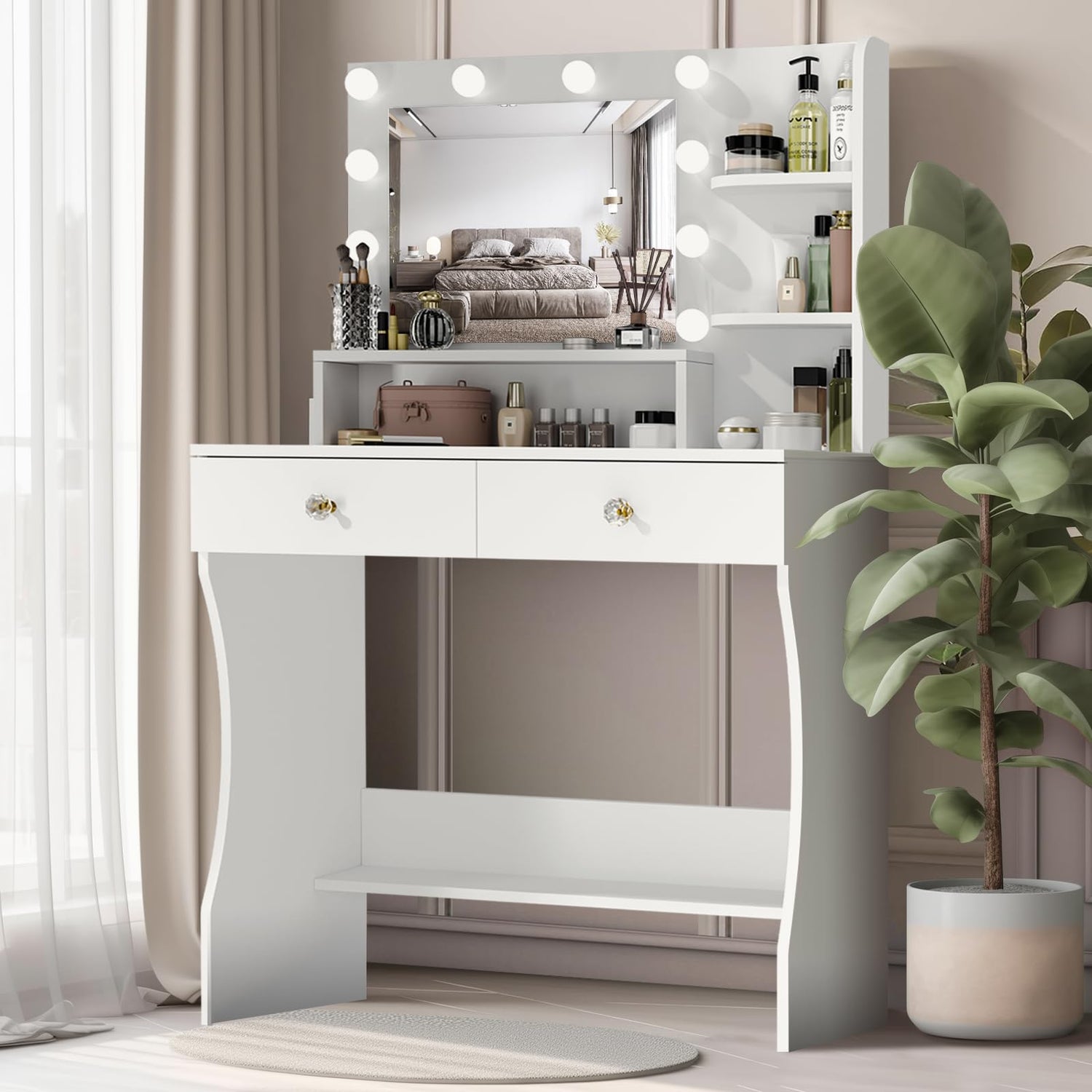 CUOZOVA Vanity Desk with Mirror and Lights, White Vanity with Lighted Mirror, Vanity with Lights with Drawers & Shelves, Makeup Vanity Desk with Lights for Bedroom & Dressing Room, 3 Lighting Modes