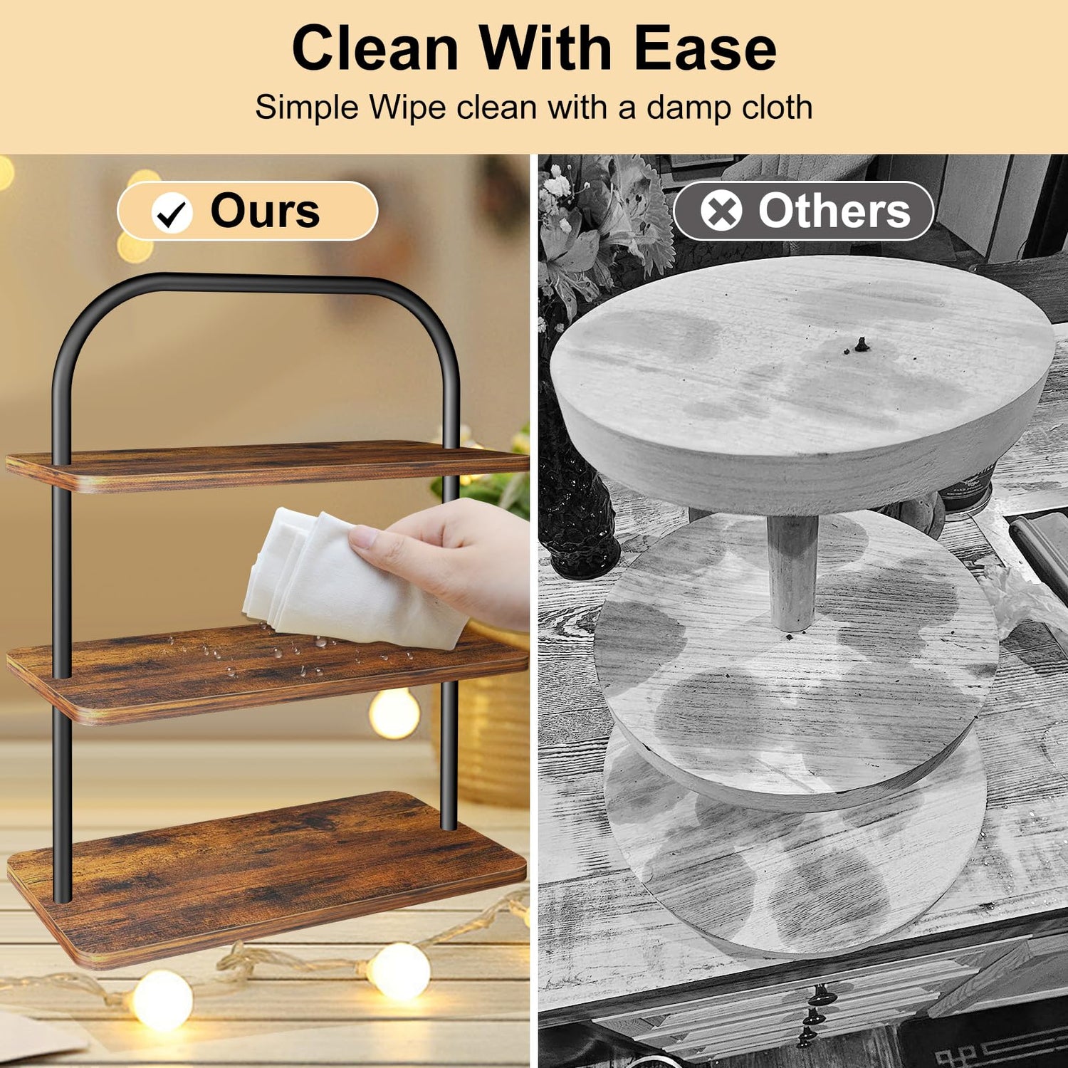 - Sturdy and Stabilize: When presenting your delightful cupcakes, stability is key. Our cupcake stand features thickened 0.5" MDF boards and a robust metal frame that ensures it withstands the demands of frequent use. Plus, with non-slip bottom pads, our cupcake tower stays securely anchored, preventing unwanted wobbling.
