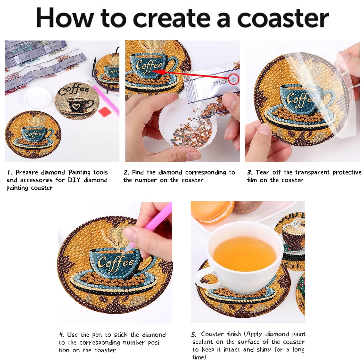 - EASY TO DIY FOR BEGINNERS- Pour your the diamonds that corresponds to the number on the coaster into the tray, then peel off the film covering the coaster and stick the corresponding diamonds on the coaster according to the number on the coaster. Finally, stick the cork base on the back of the coaster, and a unique and beautiful diamond art coaster kits is done