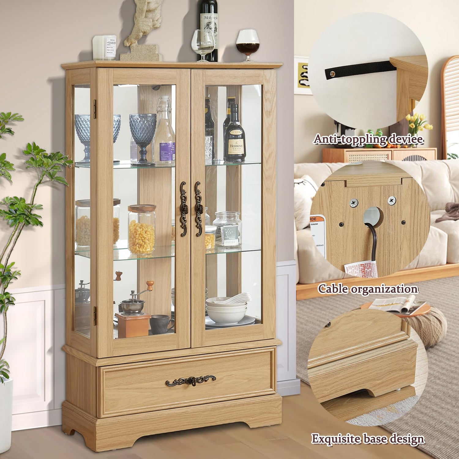 - High-quality Materials: The glass used in this china cabinet is made of tempered glass, ensuring durability and safety. And the glass door allows you to clearly see your collection