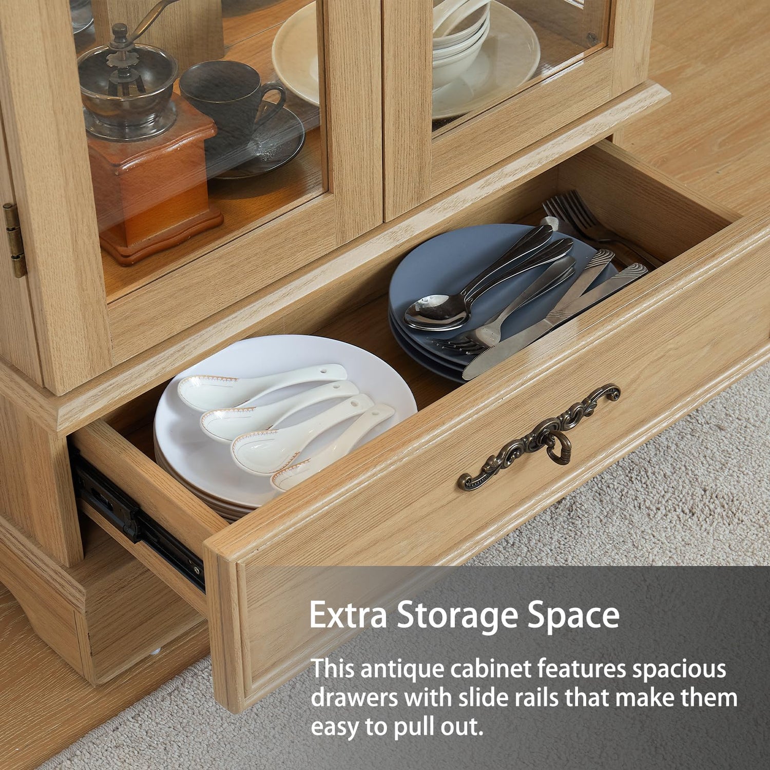 - Classic Style Cabinet: The middle shelf of this antique cabinet with glass doors can be used as a china cabinet, trophy display cabinet, antique display cabinet, and the top shelf can display lamps and decorations. There is also a drawer at the bottom for storing daily items
