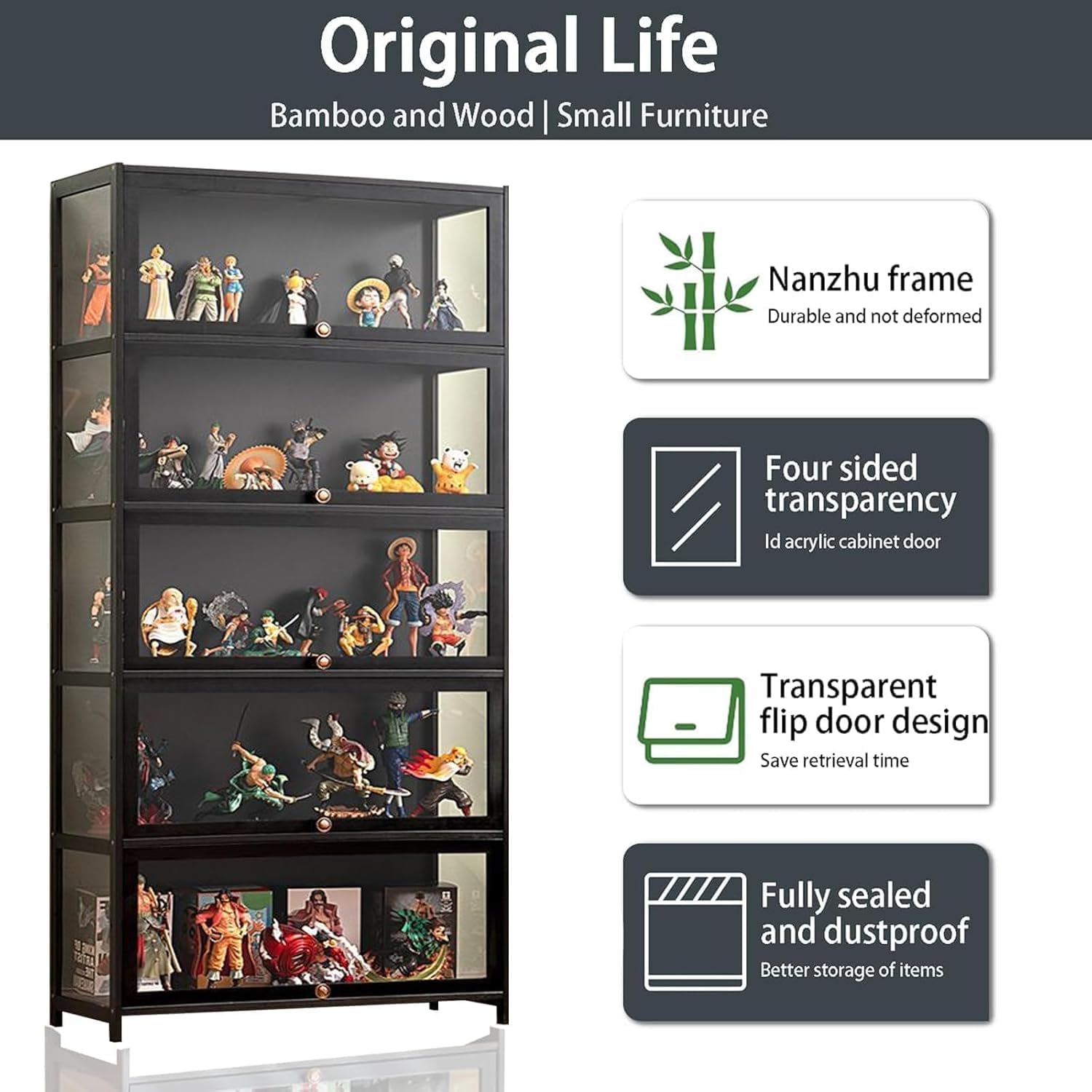 Curio Display Cabinet, 5 Tier Storage Shelves with Acrylic Glass Door, Transparent Bamboo Display Case for Figures, Display Shelves for Collectibles & Kids Bookcase for Home (Black Flip Door)